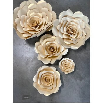 - Exquisite sets of giant paper roses in shades like off-white, burgundy, pink, and cream.