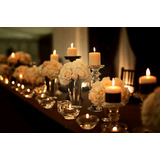 You can create fantastically beautiful and elegant pieces using simple, transparent glass vials filled with water and fresh flowers. Adding a single floating candle to each will complete the romantic piece. The design of your glass containers and the flower can be anything you like to match the theme of the party. The burning candle will create the air of intimacy and add an intricate play of light to the setting.
