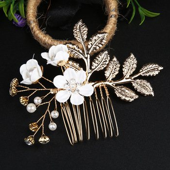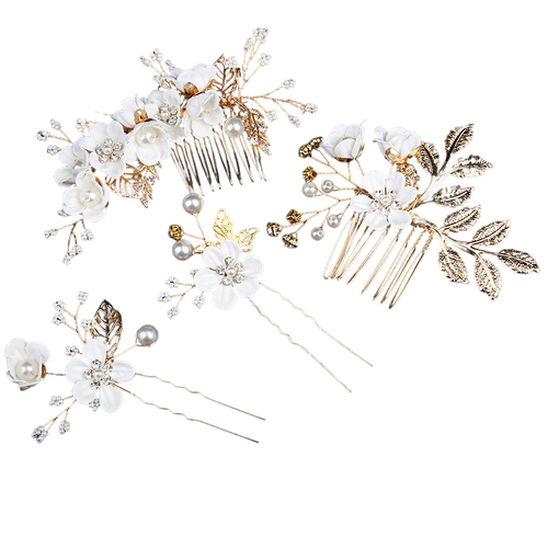 The look of sheer perfection with our enchanting 4-Piece Wedding Gold Hair Slides and Pins Set, adorned with glistening rhinestones and delicate white flowers. This set is a symphony of elegance and charm, comprising two hairpins, one petite comb, and one grand comb. Each piece is carefully crafted to add a touch of opulence to your hairstyle, creating an unforgettable bridal ensemble. The sparkling rhinestones catch the light with every move, while the pristine white flowers evoke a sense of purity and grace. Whether you choose to wear the set as a whole or mix and match the pieces, it's a versatile and captivating addition to your wedding day look.