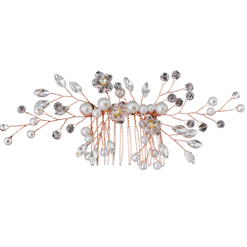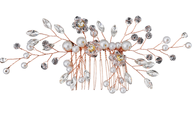 The vine-inspired design of this Rose Gold Bridal Comb brings an enchanting and organic element to your wedding ensemble. The Rose Gold metal, with its intricate detailing, mimics the delicate vines of a garden, creating a harmonious blend of nature and sophistication. Whether you're the bride or a bridesmaid, this comb effortlessly enhances your hairstyle, reflecting