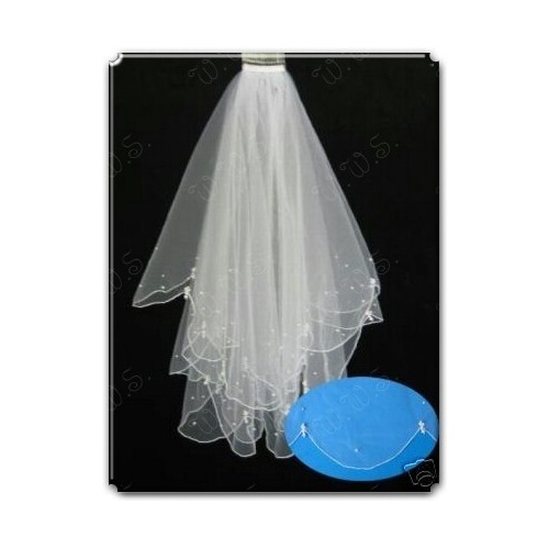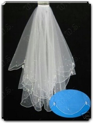 Accents: scalloped edge small pearl bead clusters on each scallop, scattered pearl lower 1/2 of veil
