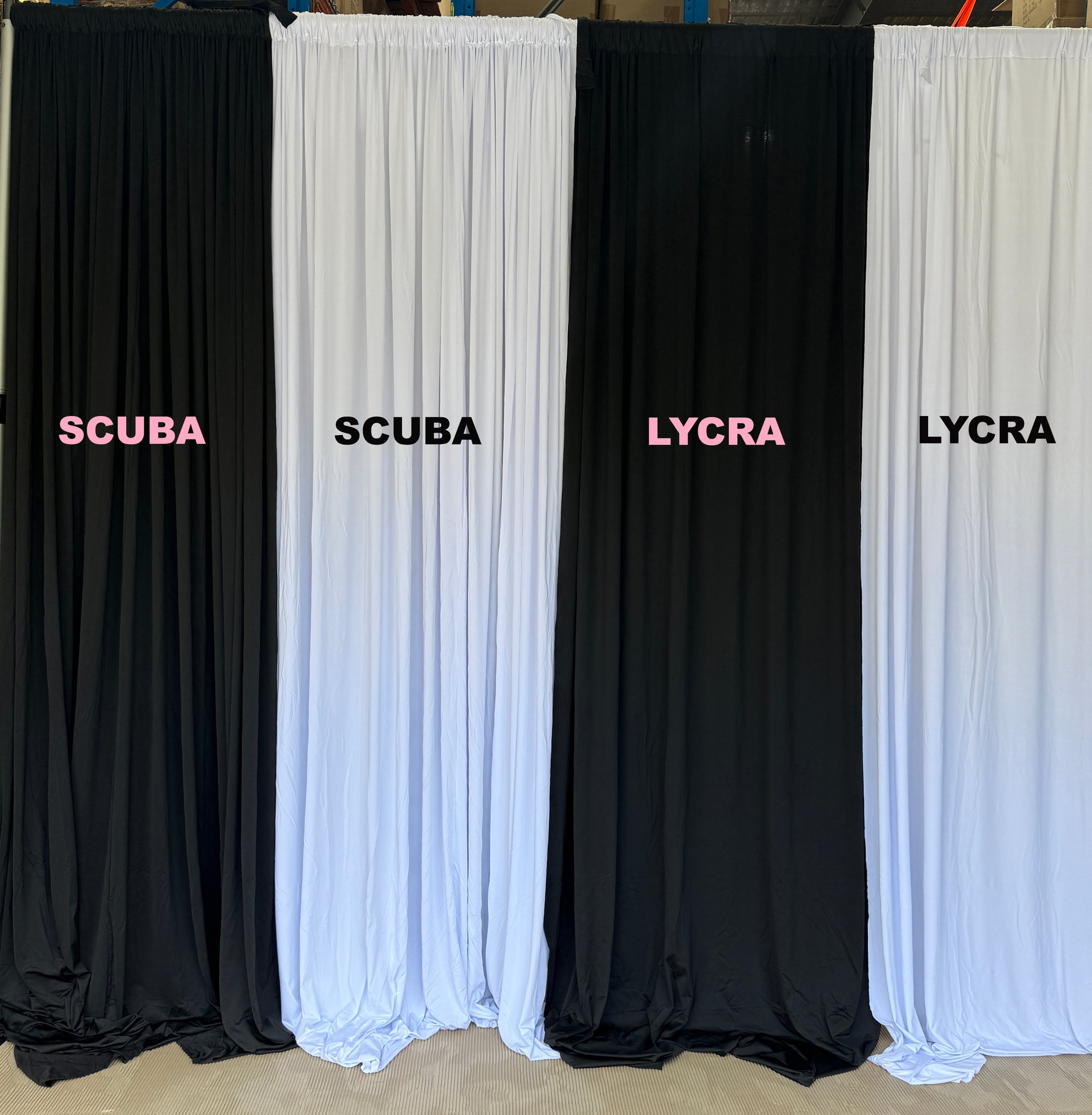 Quality: Made from 180gsm Lycra, this curtain offers a soft, flexible stretch that moves both horizontally and vertically. The four-way stretch allows the fabric to fit smoothly across frames or gather neatly for a fuller look. Lycra drapes lightly with a gentle sheen, making it ideal for creating layered designs or blocks of colour within larger backdrop setups.