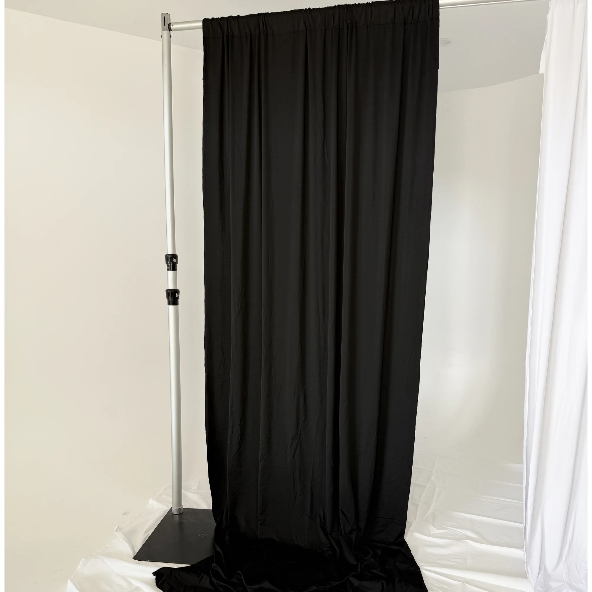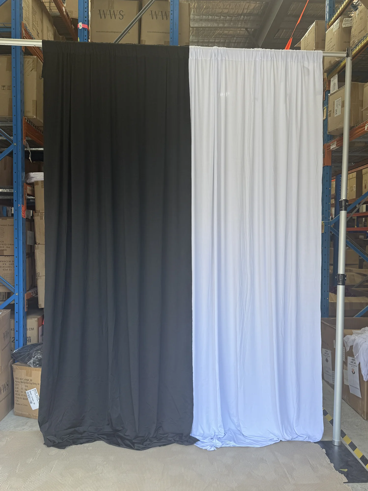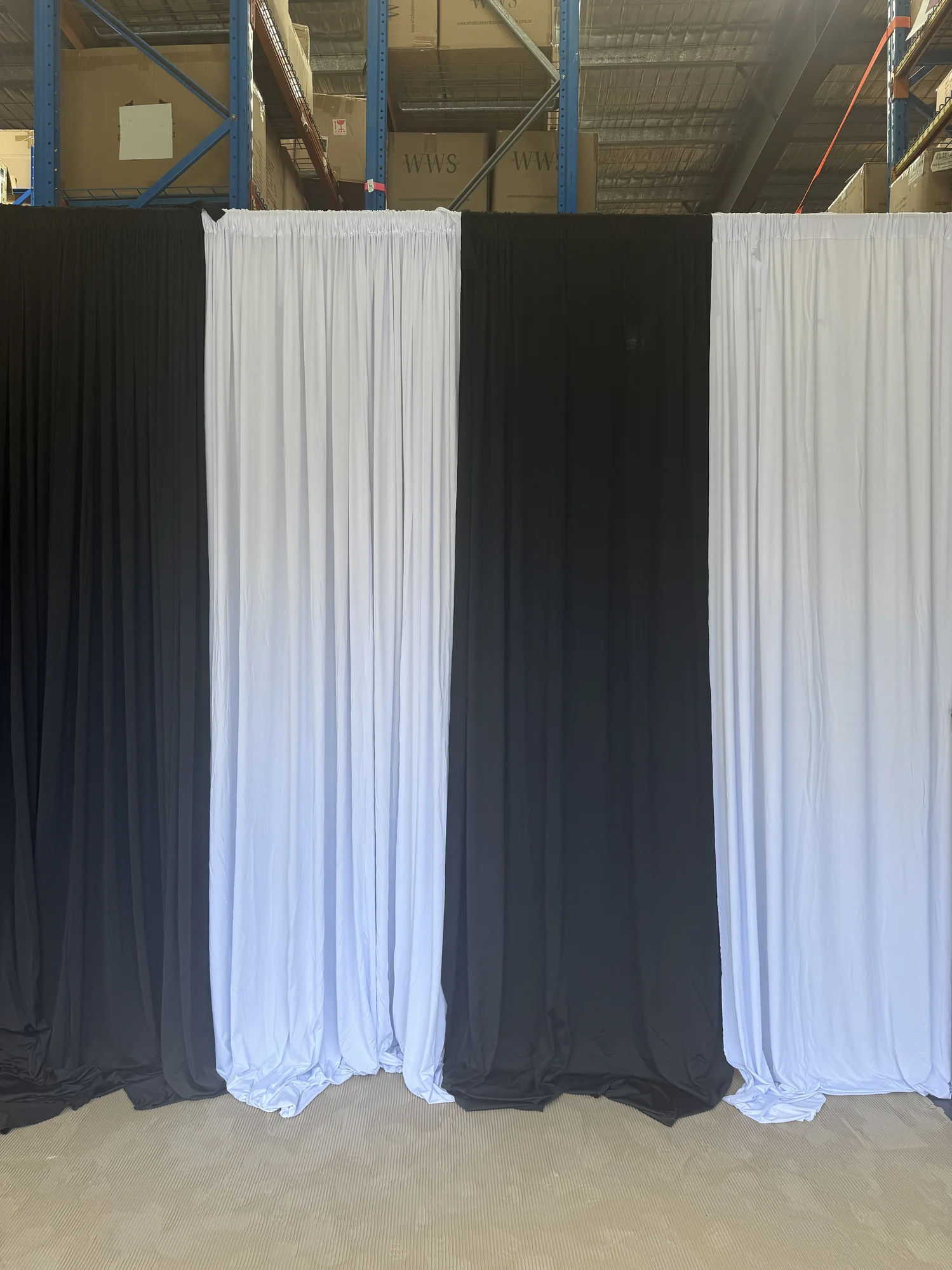 Each panel measures 1.5m wide (ungathered) x 3m tall and includes a 10cm rod pocket plus top ties for easy installation on standard stands or crossbars. The four-way stretch allows the fabric to fit tightly across frames or gather neatly for a soft, pleated finish.