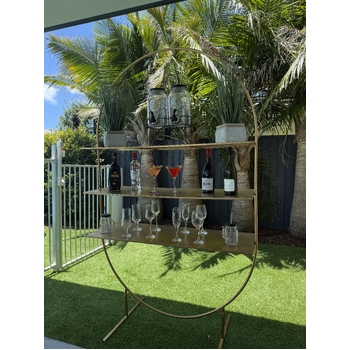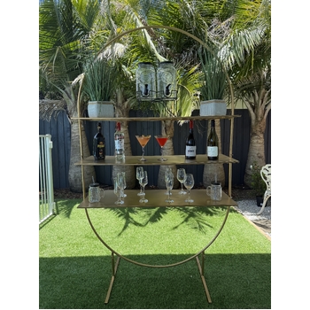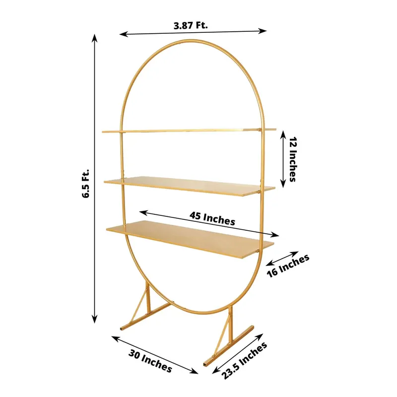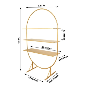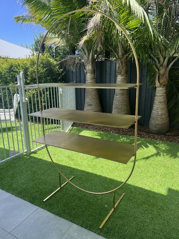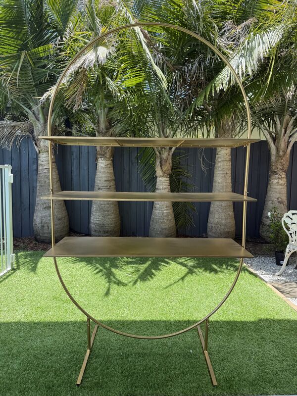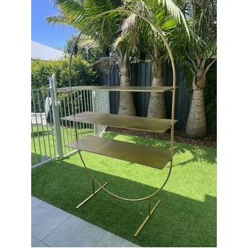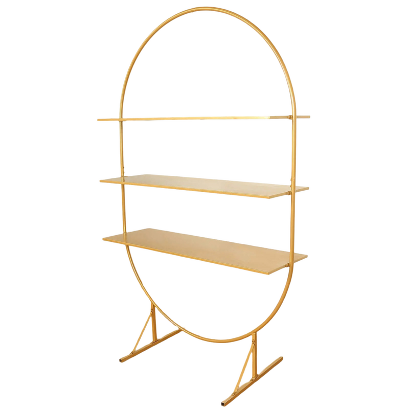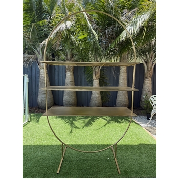 Create a stunning display for your wedding or event with this Large Gold Metal Arch Stand, designed to fit in with any decor with stylish functionality. Standing tall at 198 cm and featuring three large shelves.