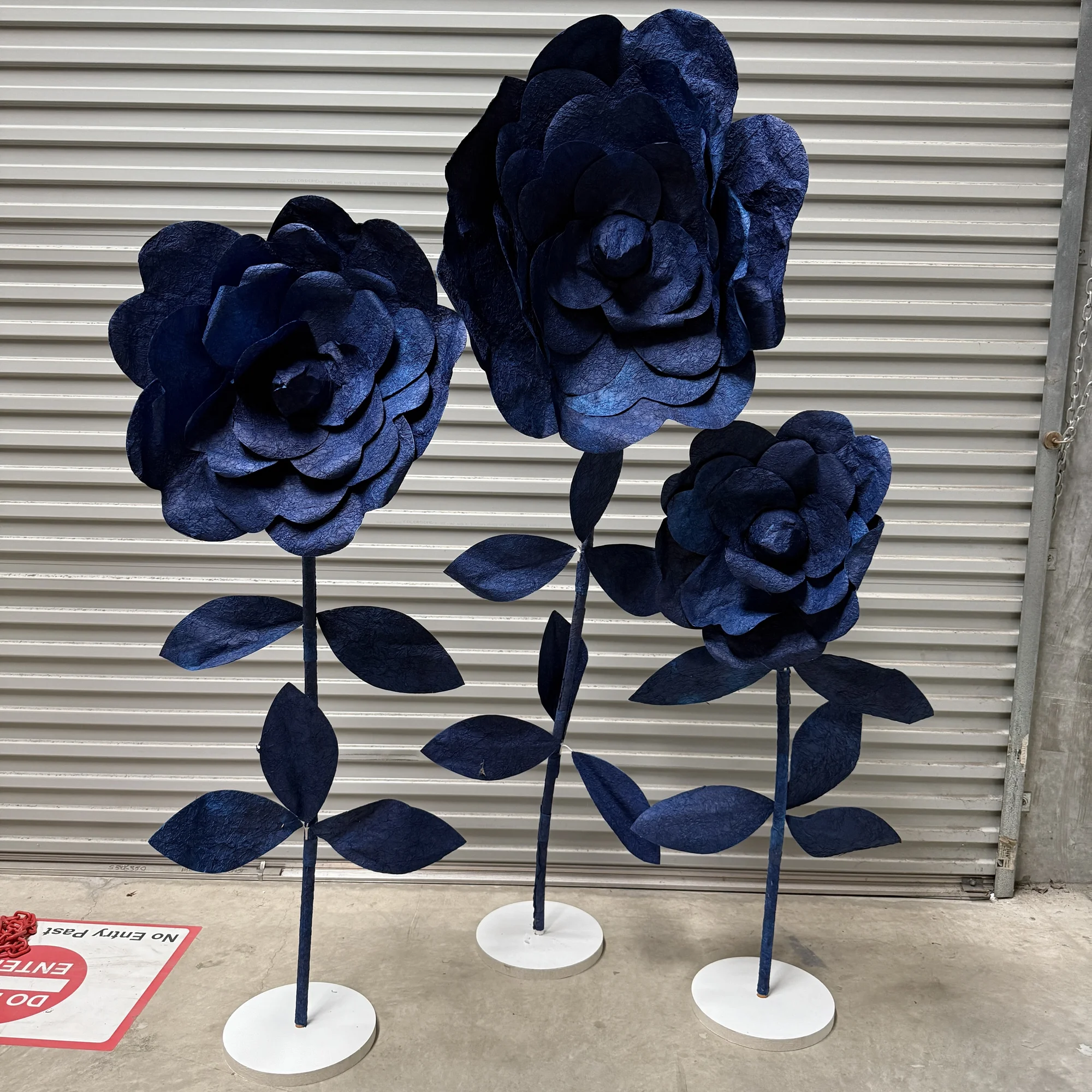 This set of 3 giant artificial roses features textured linen-look card petals in a Dark Blue tone. Each flower is mounted on its own bendable stem with base, making them ideal for creating high-impact wedding displays.