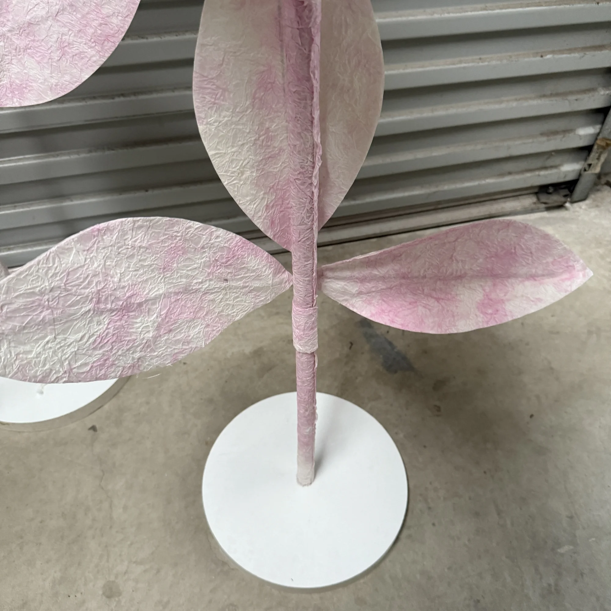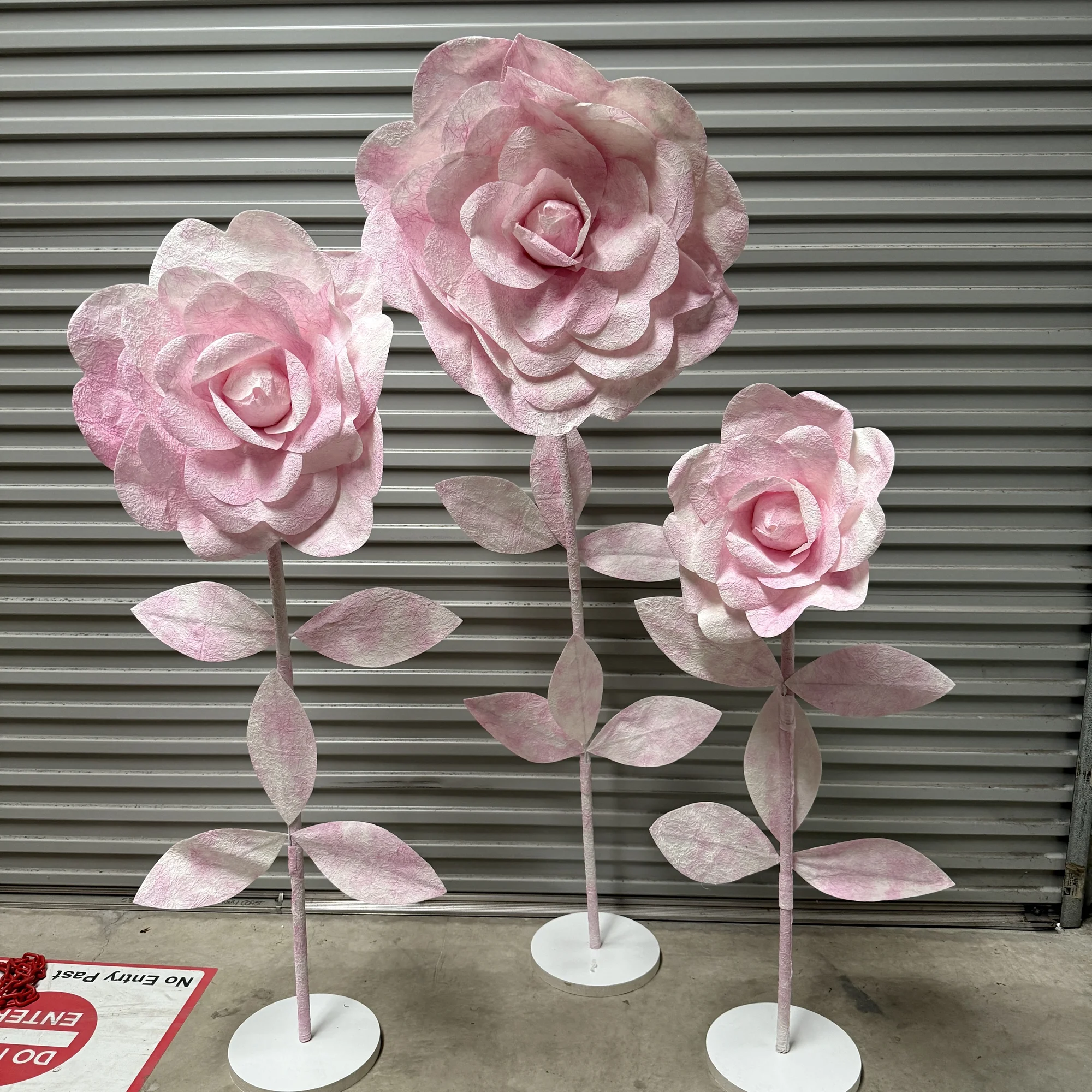 Set of 3 Giant Rose Flowers – Pink/White with Stems and Bases