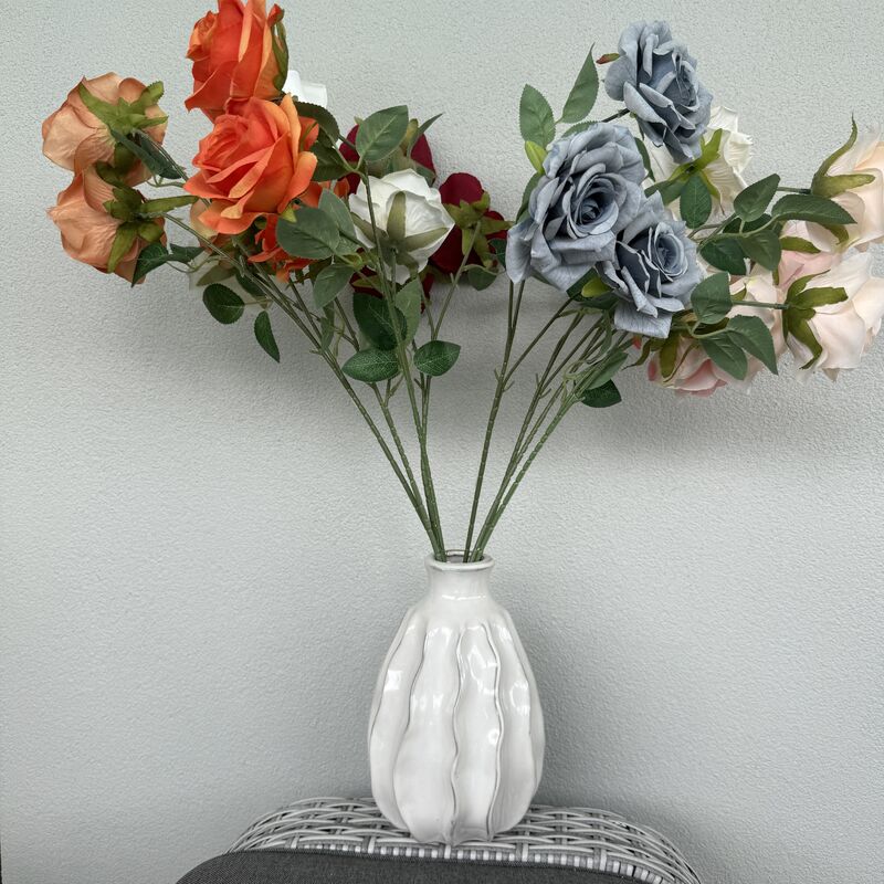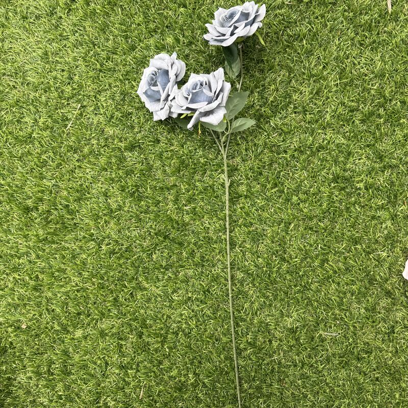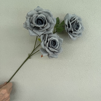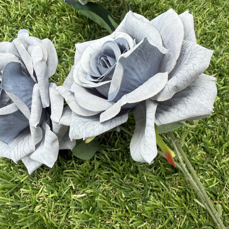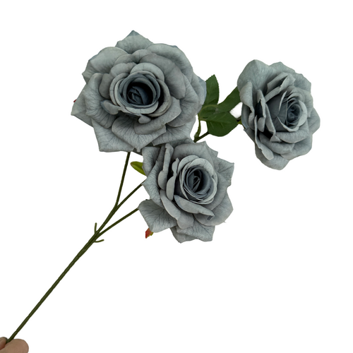 Add a touch of classic beauty to your floral arrangements with our 3-head Dusty Blue artificial rose stem. Designed for versatility, this stem features three rose heads with realistic-looking petals showing vein details, coated so they spring back into shape and do not fray, each measuring approximately 8cm in diameter (unreflexed). With fabric flowers and leaves, along with plastic-coated wire stems, this piece offers both flexibility and durability.