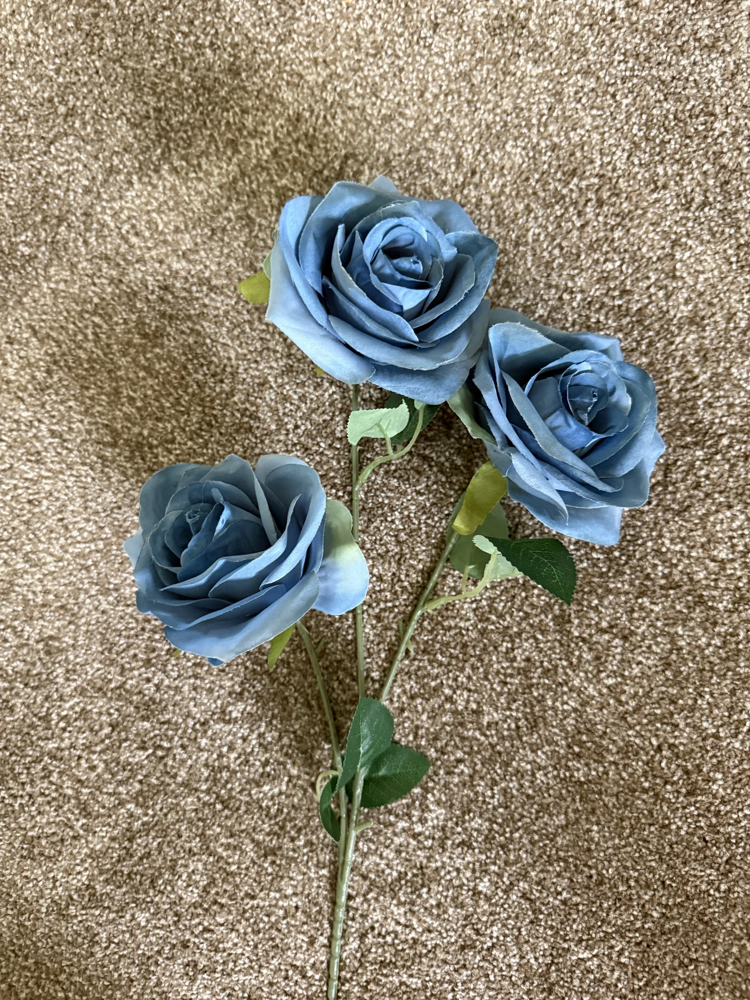 Add a touch of classic beauty to your floral arrangements with our 3-head Deep Dusty Blue artificial rose stem. Designed for versatility, this stem features three rose heads, each measuring approximately 8cm in diameter (unreflexed). With fabric flowers and leaves, along with plastic-coated wire stems, this piece offers both flexibility and durability.