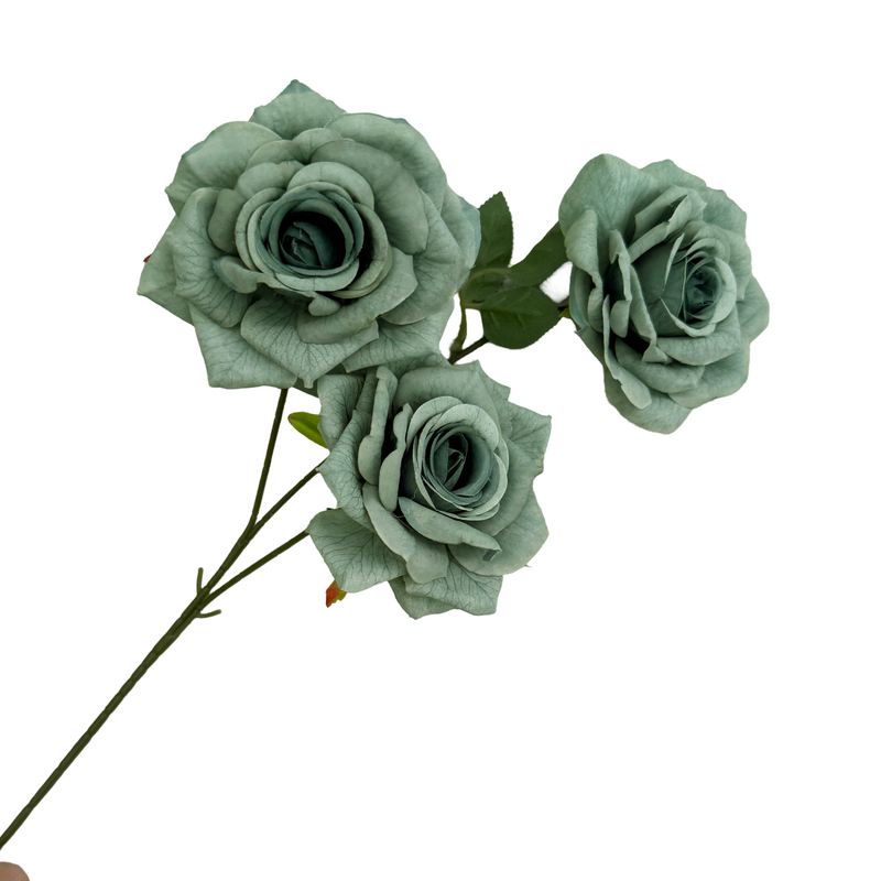 Add a touch of classic beauty to your floral arrangements with our 3-head Sage Green artificial rose stem. Designed for versatility, this stem features three rose heads with realistic-looking petals showing vein details, coated so they spring back into shape and do not fray, each measuring approximately 8cm in diameter (unreflexed). With fabric flowers and leaves, along with plastic-coated wire stems, this piece offers both flexibility and durability.