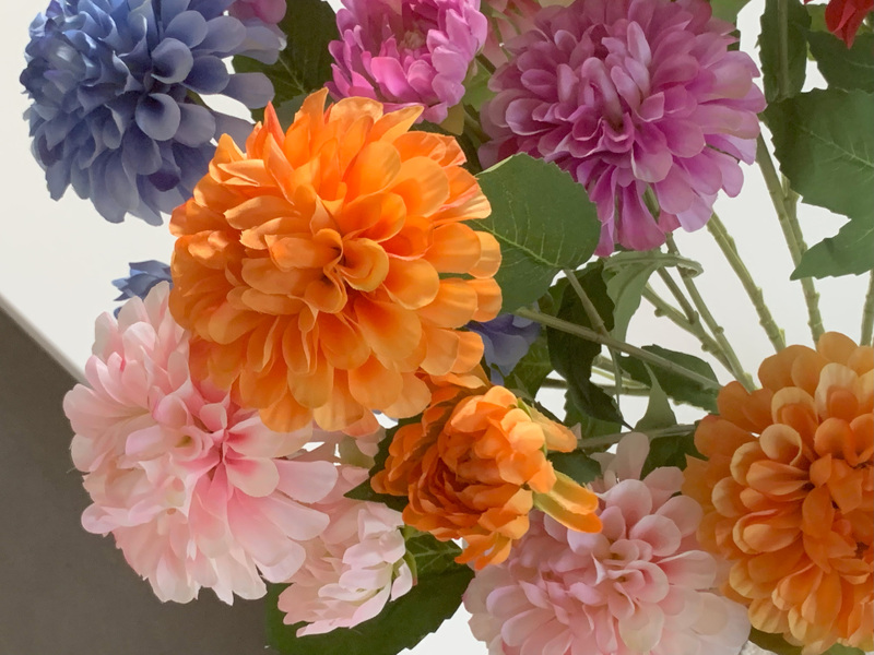 Four sets of fabric leaves add depth and texture, creating a realistic and vibrant impression. But versatility is this dahlia's true charm! The stem, crafted from a flexible blend of plastic and wire, can be easily cut into three shorter stems (25-35cm) – perfect for creating smaller arrangements or filling those delicate corners.