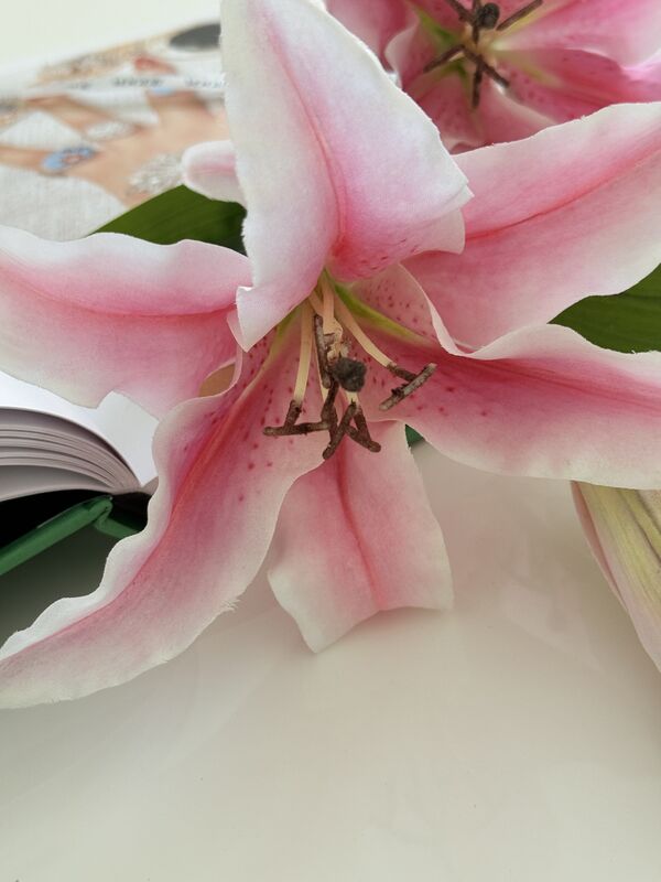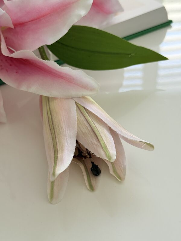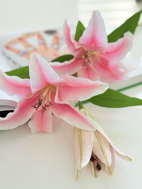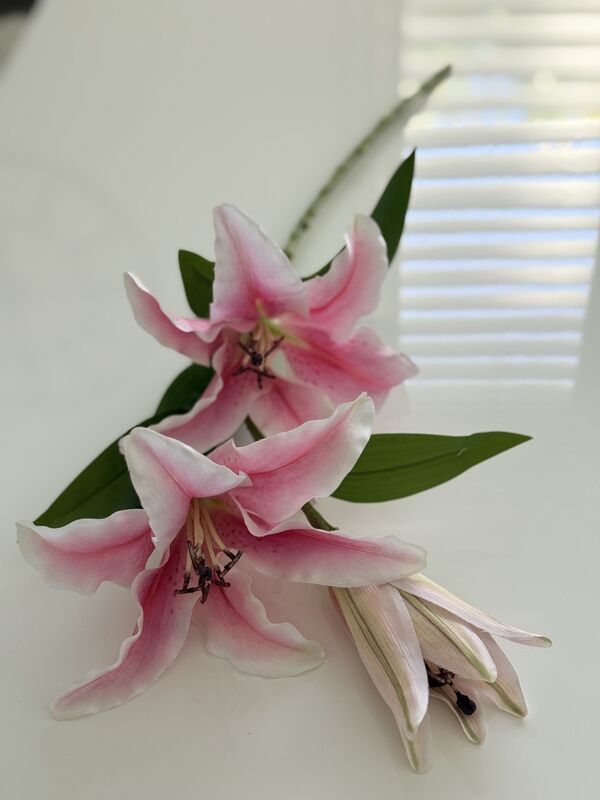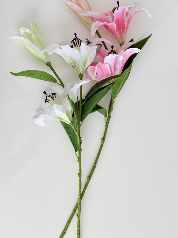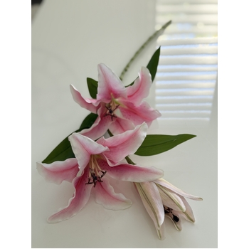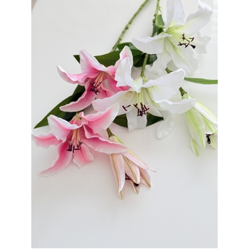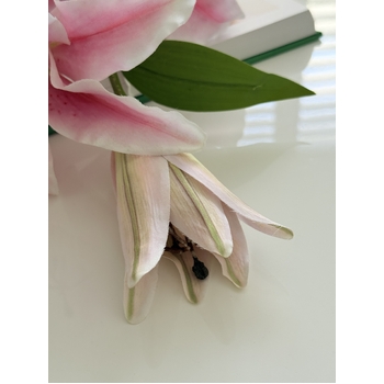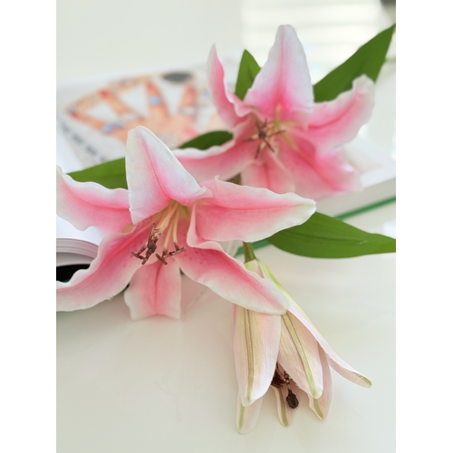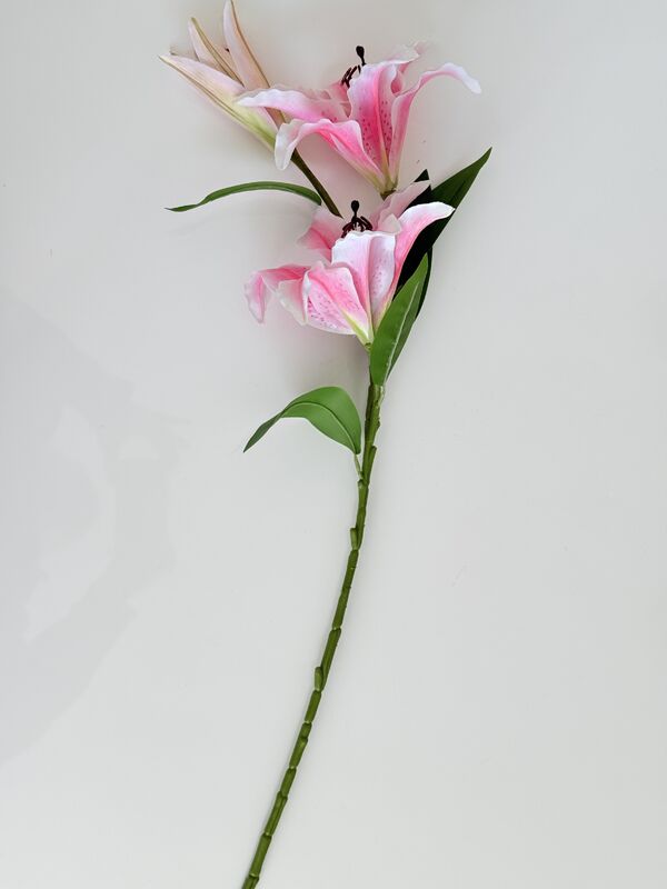 This 75cm Pink Artificial Lily Stem features two open blooms and one closed bud, offering a full and natural look for wedding or event styling. The flowers measure approximately 20cm across when open and are made with soft fabric petals and realistic plastic stamens. The wired stem can be trimmed or separated into three shorter stems as needed for arrangements.