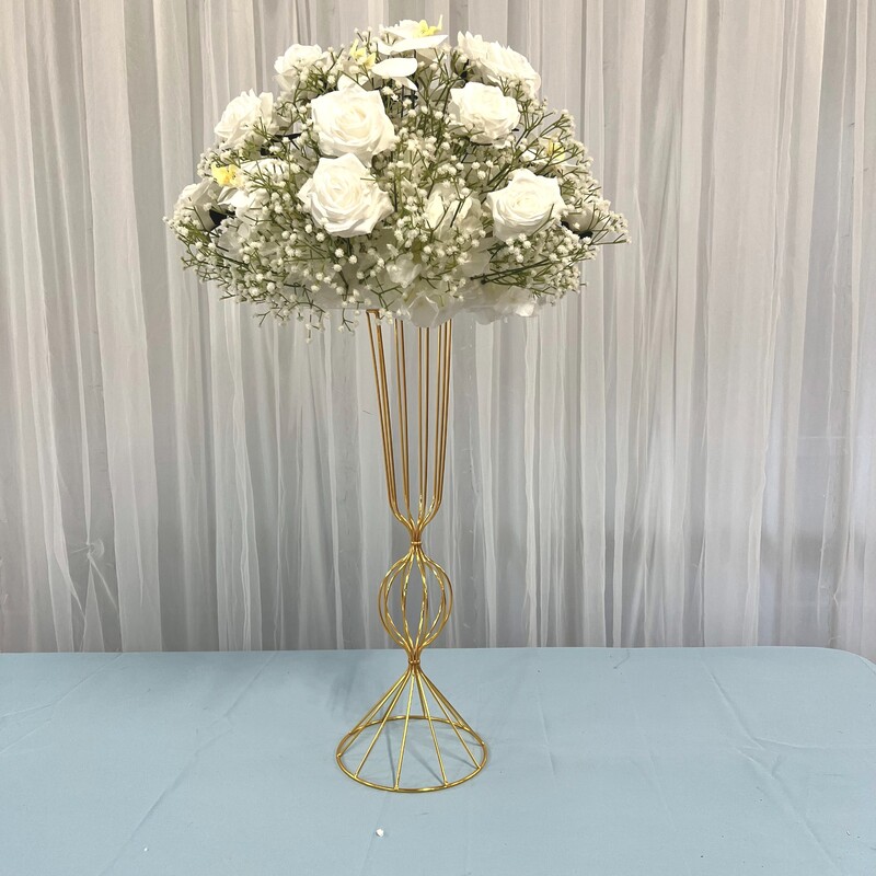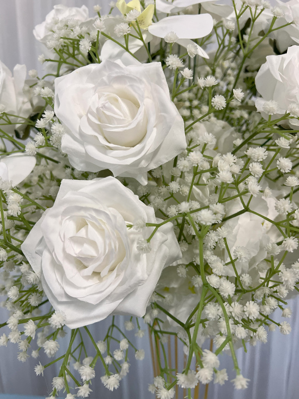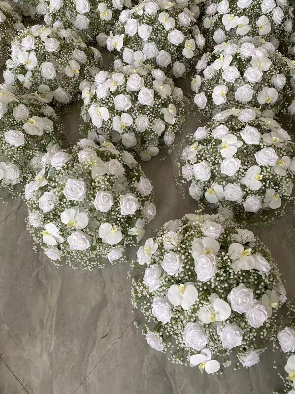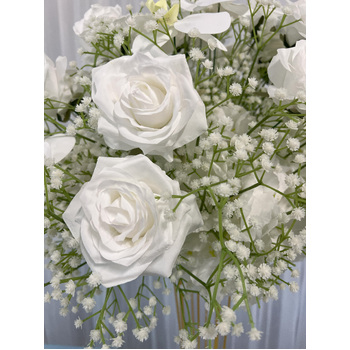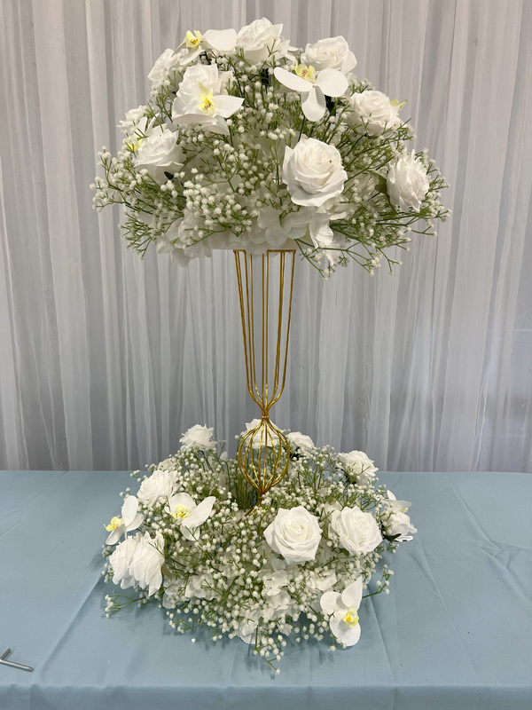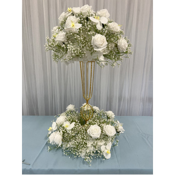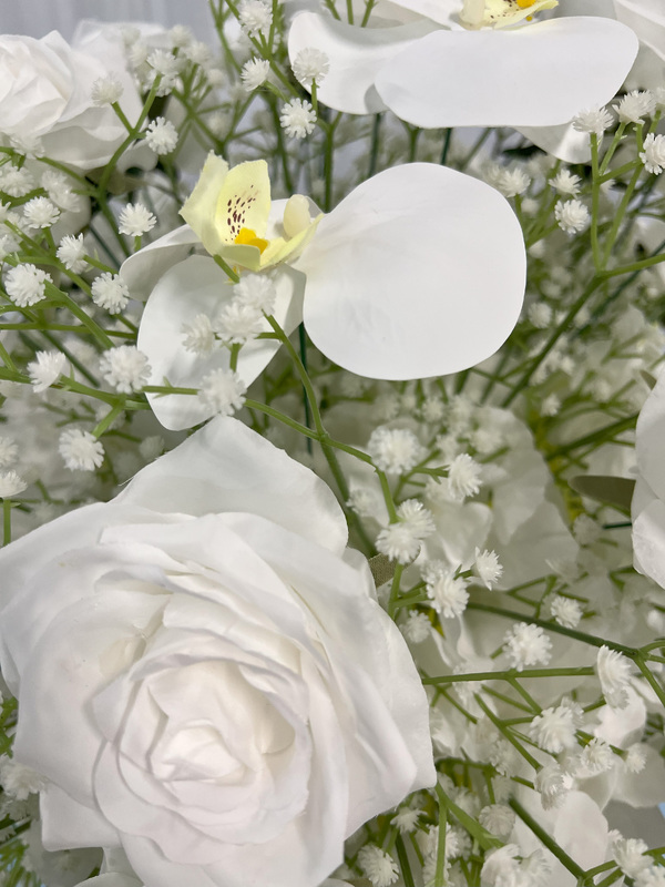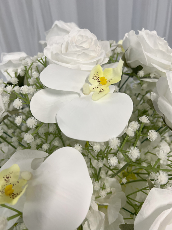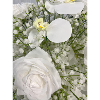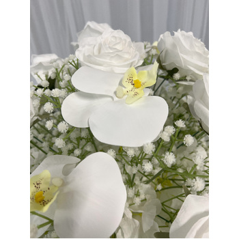 Floral Ball Arrangement containing white rose, orchids and babies breath. We have matching rings, arch flowers and runners available in this style on different listings. These sit perfectly on our geometric, hourglass and scroll centrepieces along with our flower stand/Plinths.