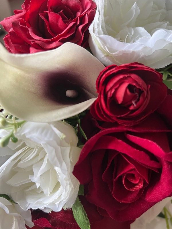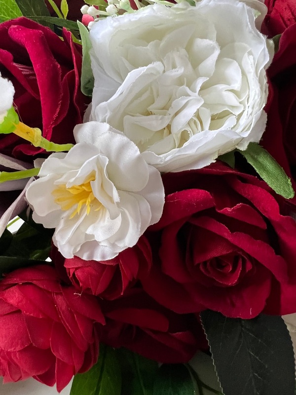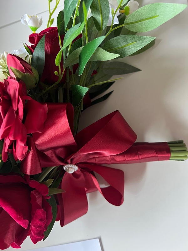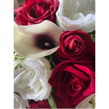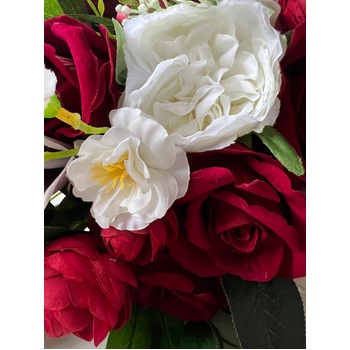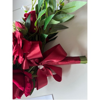 Size of Flowers: approx Lily (foam)6cm, Roses (velvet) 7.5cm, peonies (fabric) 7.5cm, lots of other filler flowers and greenery, eucalyptus included in this bouquet