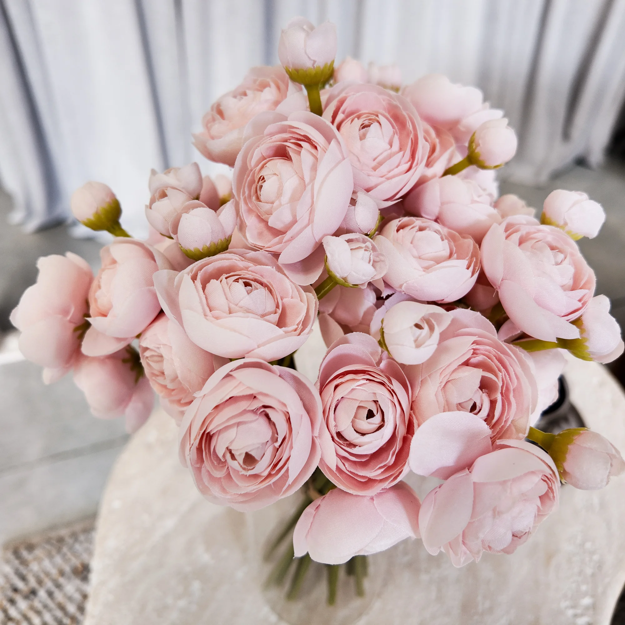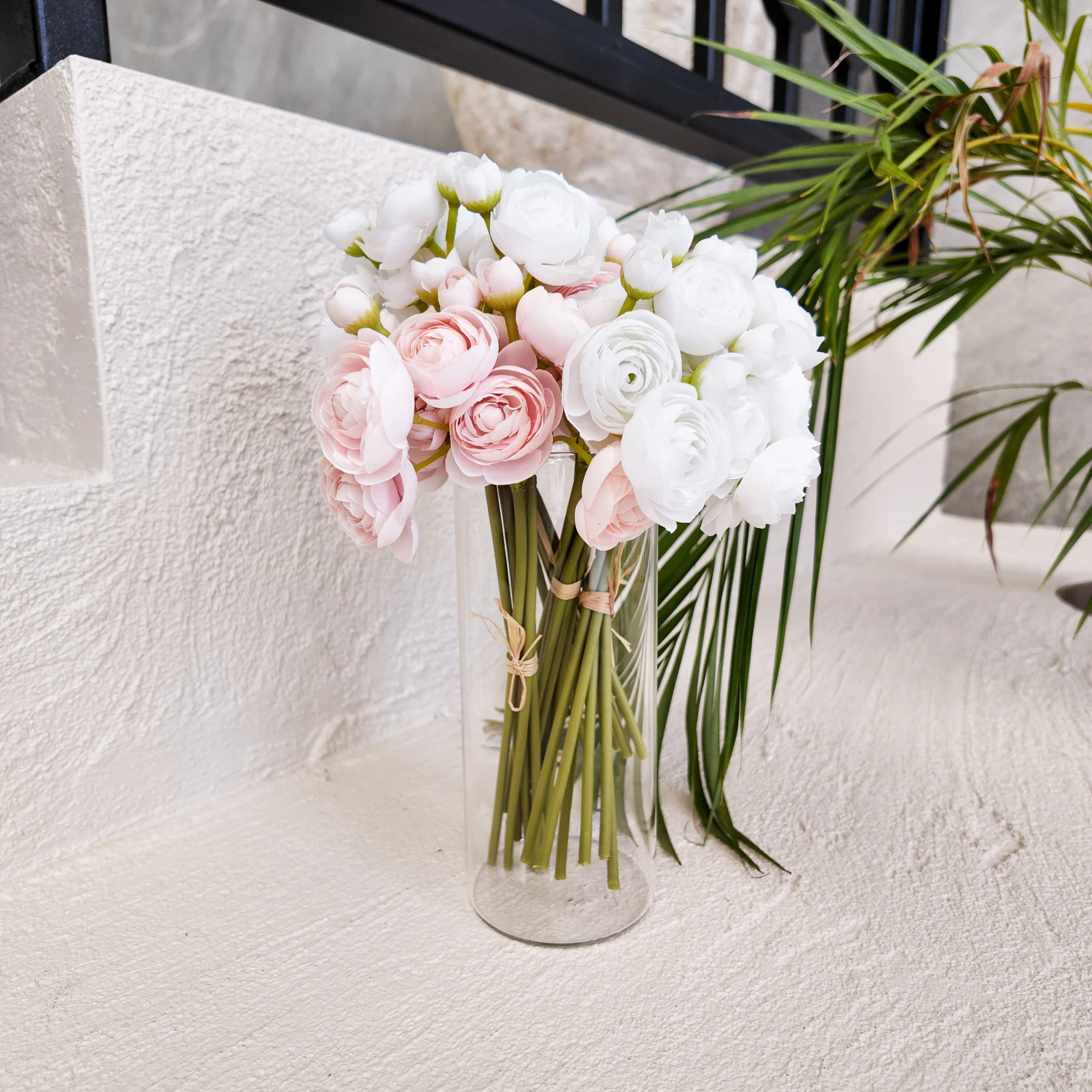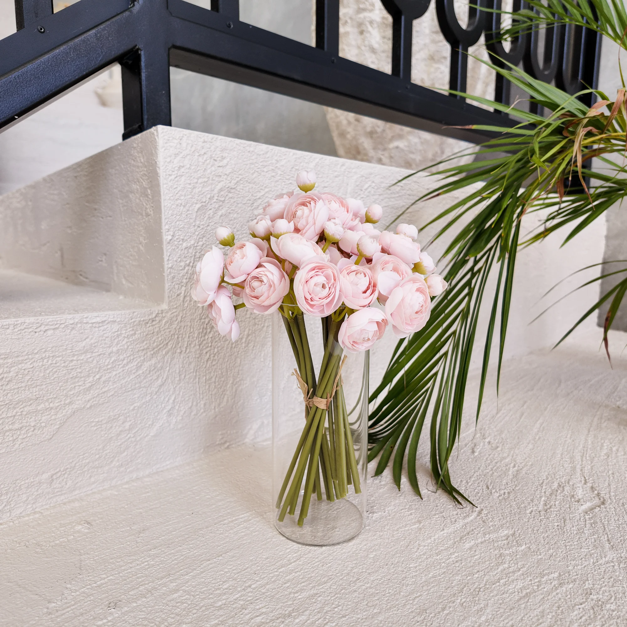 This mini ranunculus flower bunch features six individual artificial stems, each with two open flowers and two buds. The compact flower size and clean stem length make this bunch ideal for small bud vases, table styling, and fine floral details.