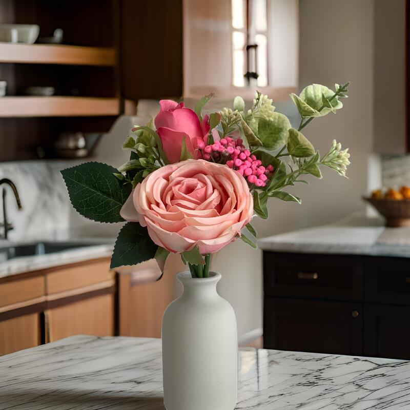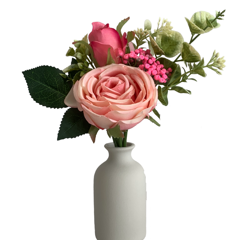 Bring a touch of delicate beauty to any setting with our 27cm Small Artificial Bouquet in Pink. This charming arrangement features a Pink peony in full bloom (8cm diameter), a contrasting darker pink rosebud (4cm diameter), and accents of hydrangea, greenery, and pink berries.