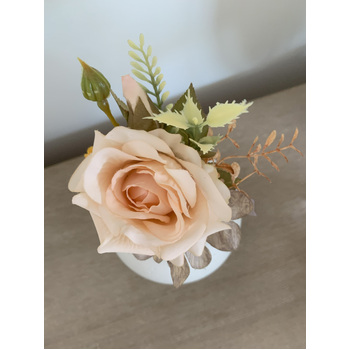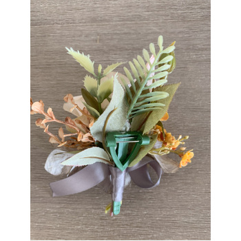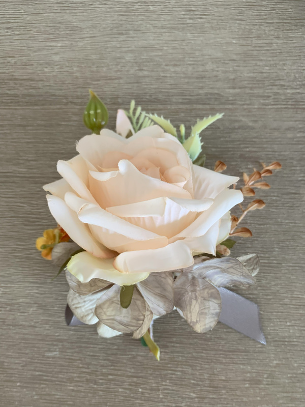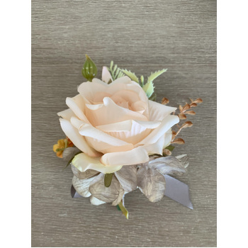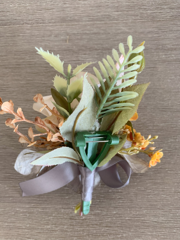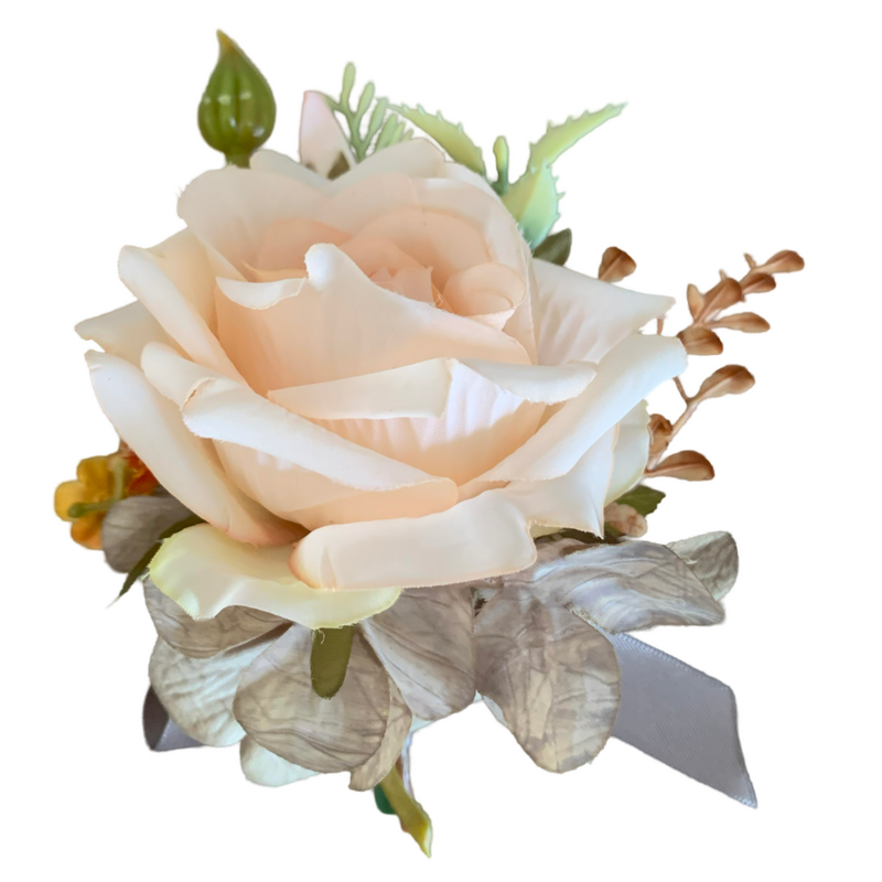 Add a touch of tradition to your wedding or special occasion attire with this classic Buttonhole. Featuring one large rose (one open at 7cm diameter ), delicate greenery, and hydrangea filler flowers. The standard pin on the back ensures easy and secure attachment, while a satin-wrapped stem adds a touch of sophistication.