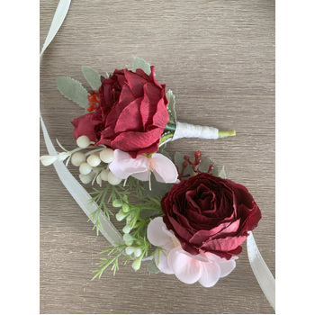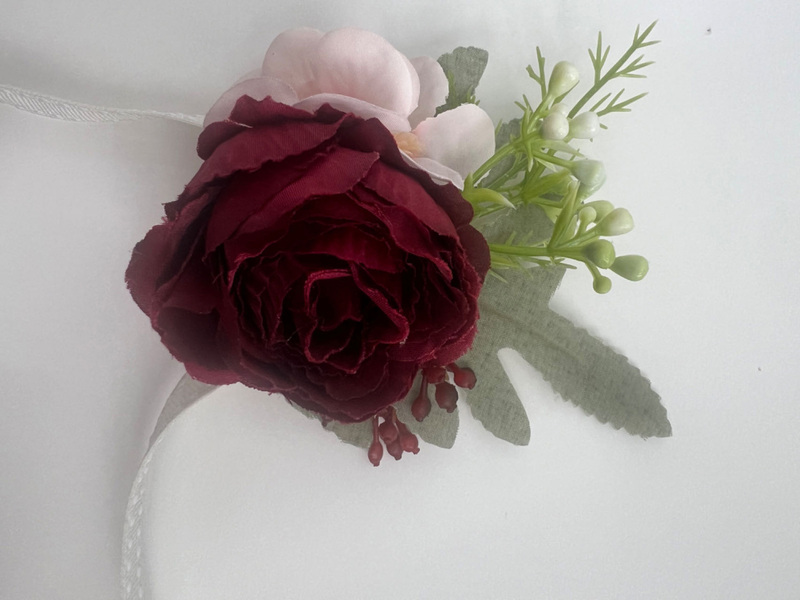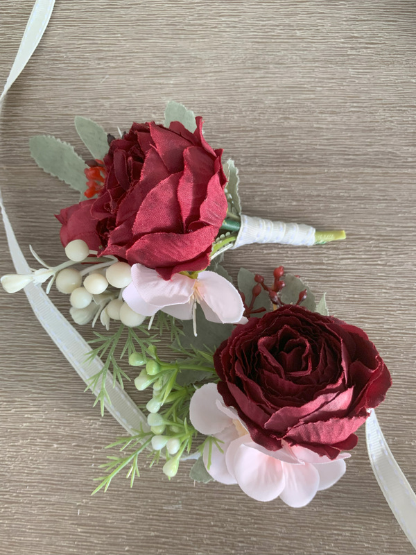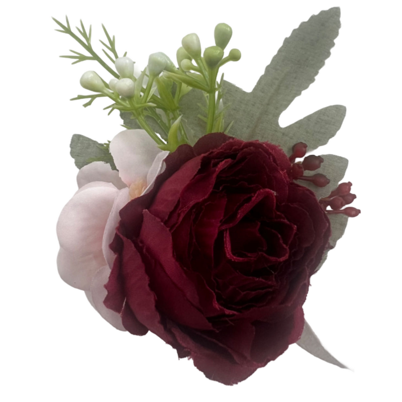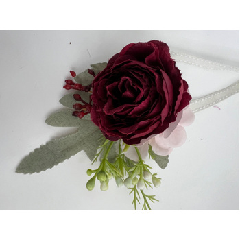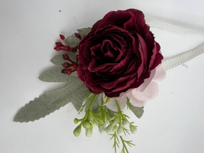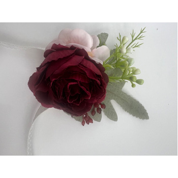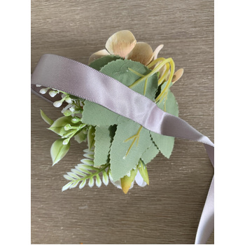 Add a touch of tradition to your wedding or special occasion attire with this classic corsage. Featuring one large peony rose (one open at 5cm diameter ), 3 small mini roses, delicate greenery, and hydrangea filler flowers. Satin Ribbons in grey to attach to the wrist.