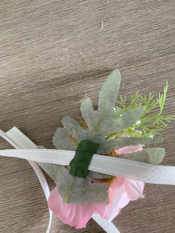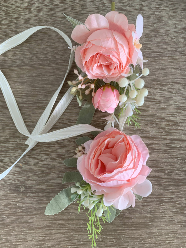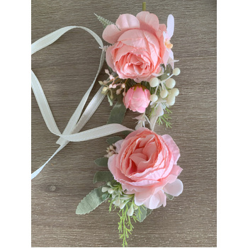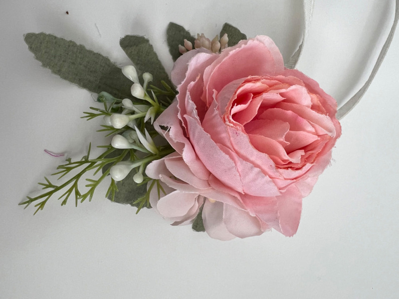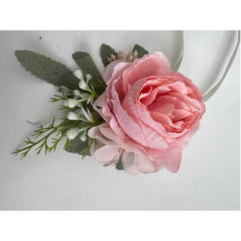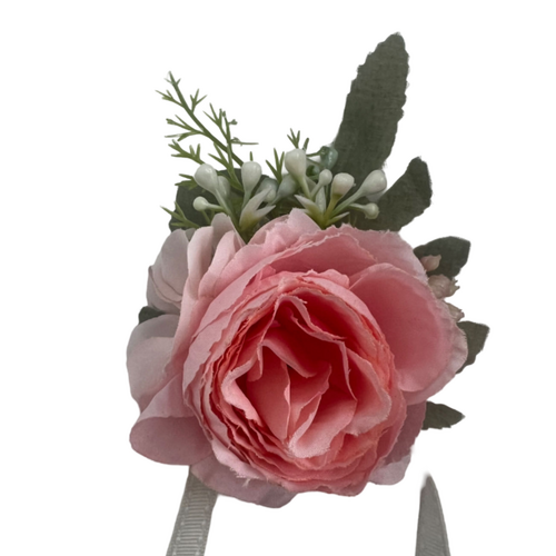 Add a touch of tradition to your wedding or special occasion attire with this classic corsage. Featuring one large peony rose (one open at 5cm diameter ), 3 small mini roses, delicate greenery, and hydrangea filler flowers. Satin Ribbons in grey to attach to the wrist.