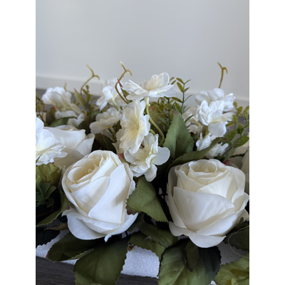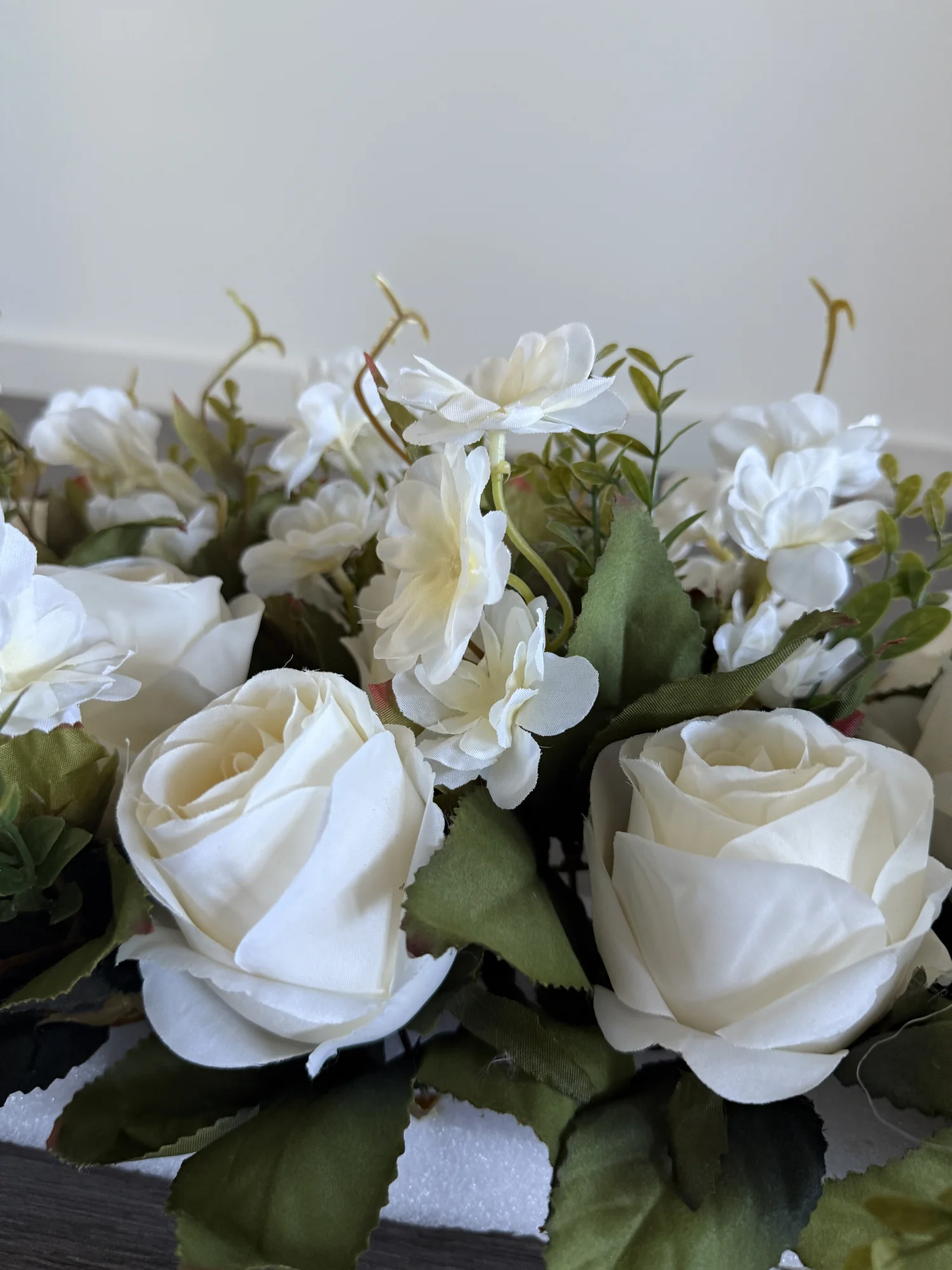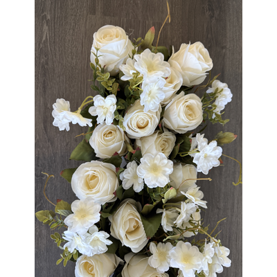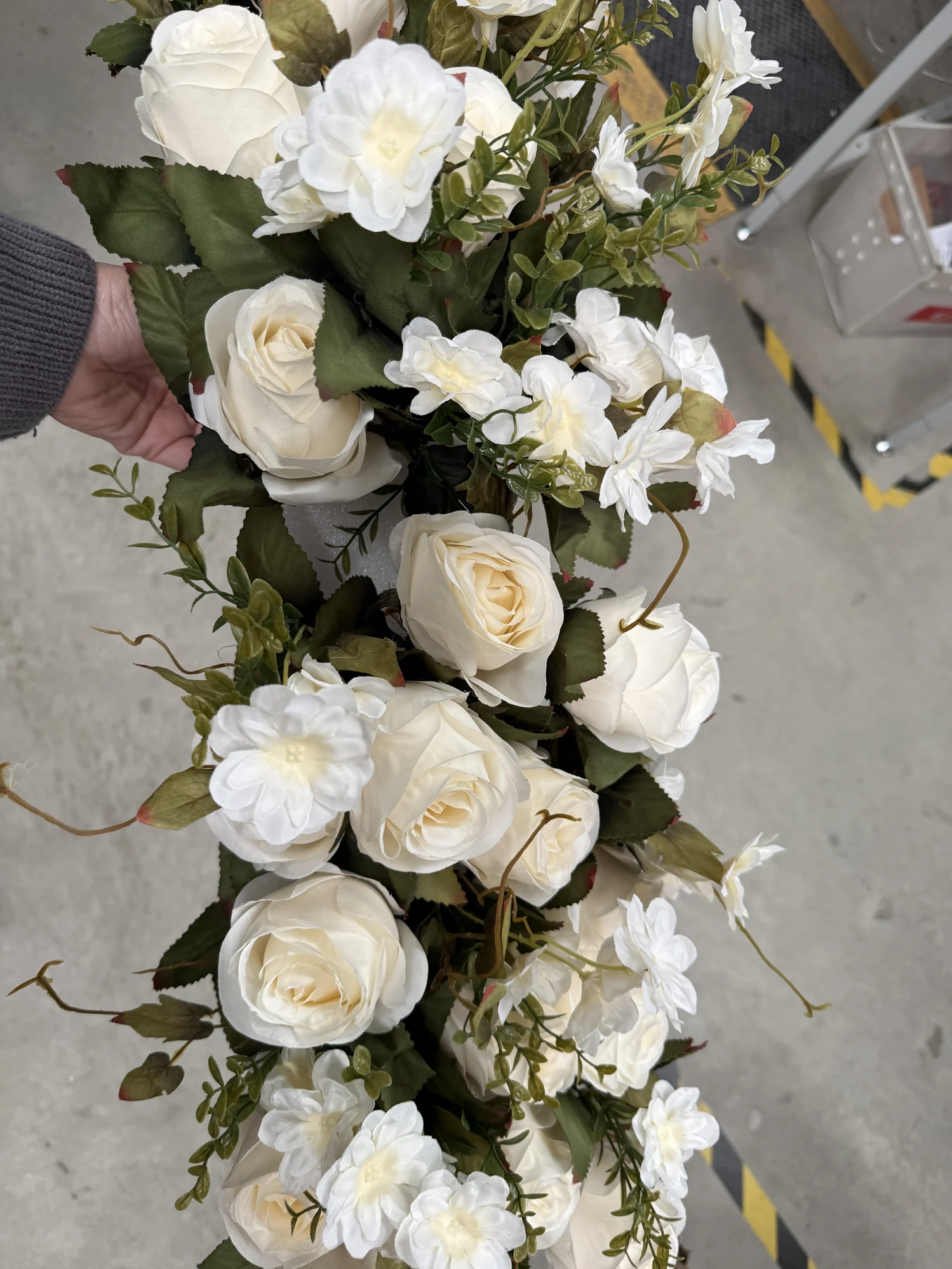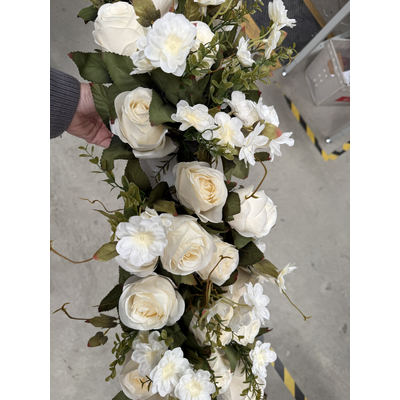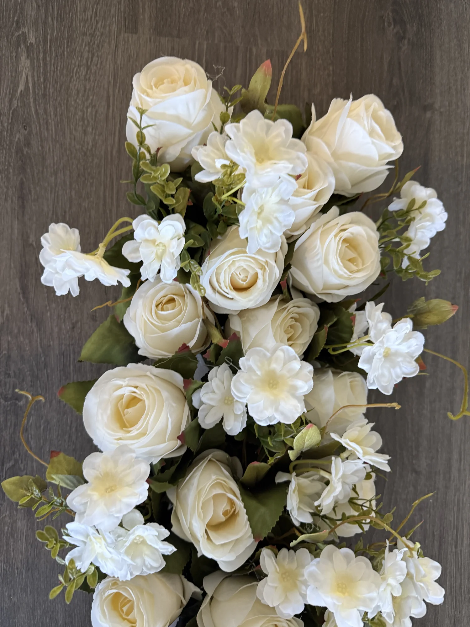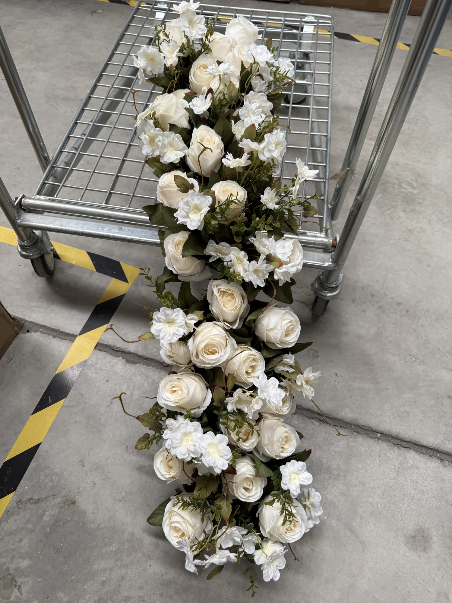 This artificial floral runner features semi-closed white and cream rose buds, surrounded by delicate filler flowers and greenery. The arrangement is set on a flat white polyfoam base, making it lightweight and easy to attach to wedding arches, signage, or the front of tables.