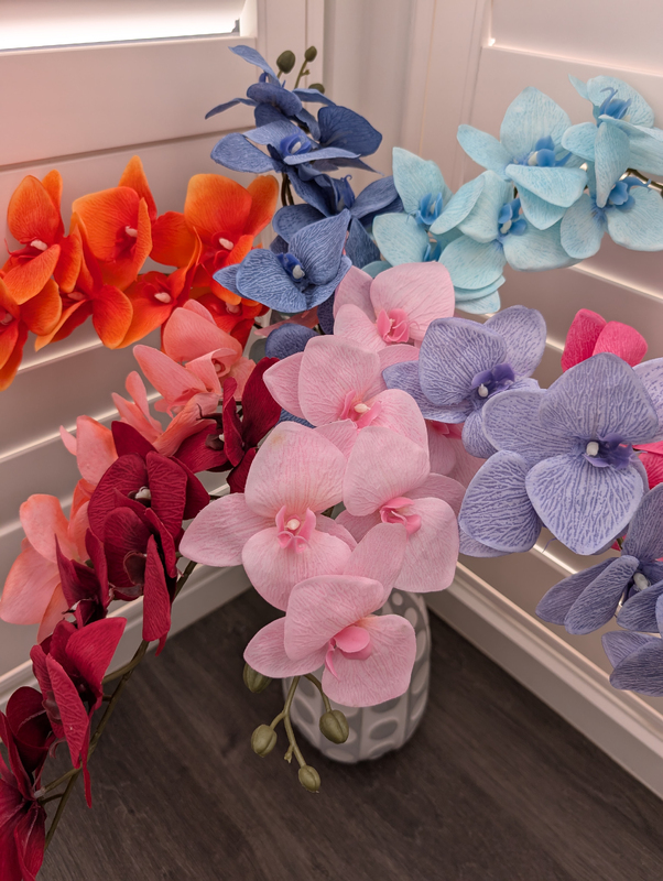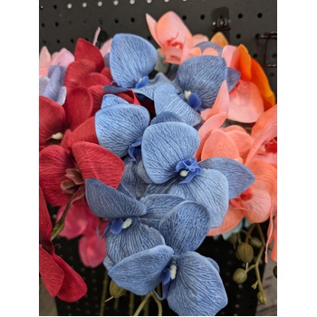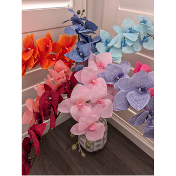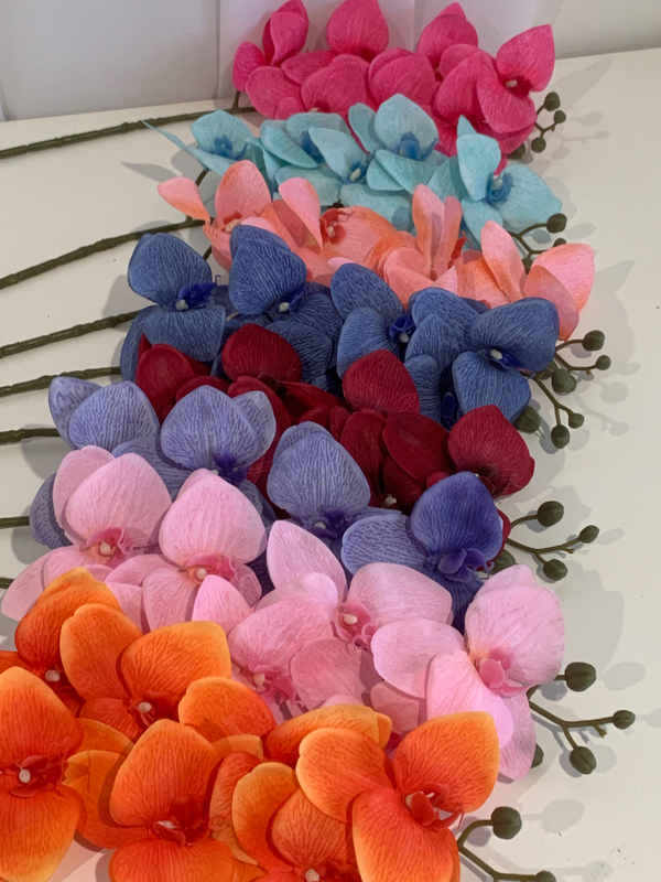 Bring a touch of elegance to your decor with our 75cm 7 Head Cymbidium stem. Each flower features five detailed fabric petals, approximately 10cm in diameter, creating a lifelike display. The 46cm plastic-coated bendable wire stem offers flexibility for easy arranging in bouquets, centrepieces, or home decor. Perfect for weddings, events, or adding a sophisticated touch to your home, this Cymbidium stem is designed to provide lasting beauty without the upkeep.