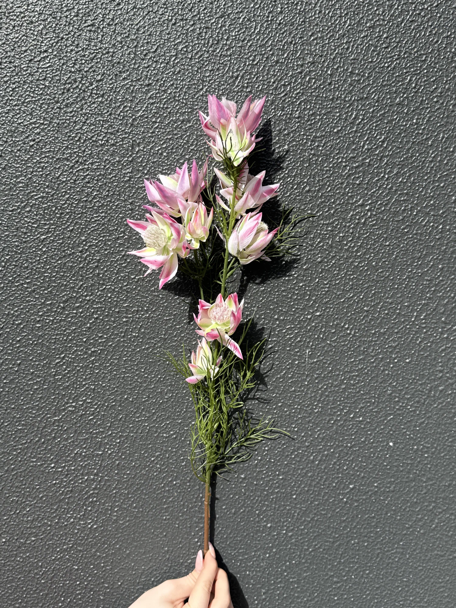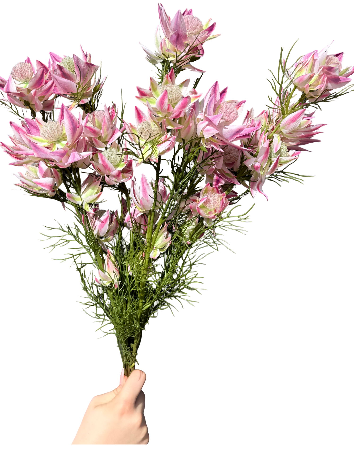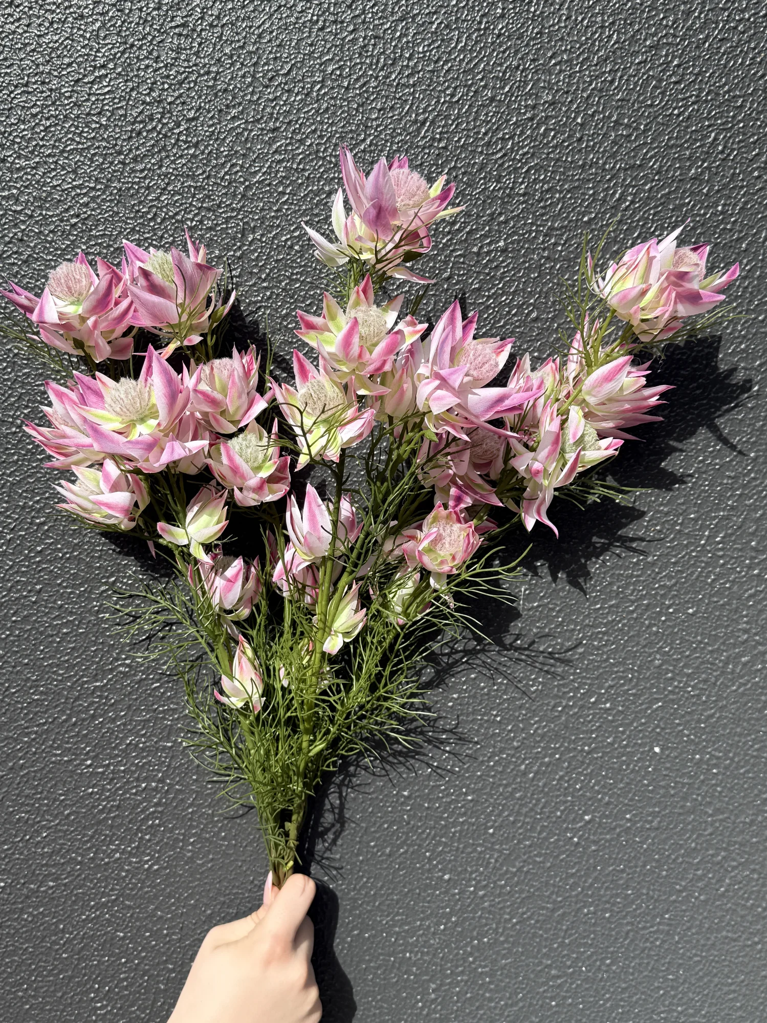 Inspired by Serruria florida, a South African species commonly known as Blushing Bride, this bloom is popular in wedding flowers for its soft blush colour and delicate, romantic appearance. Often used as a filler or feature flower in modern bouquets, it pairs well with roses, natives, or soft greenery.