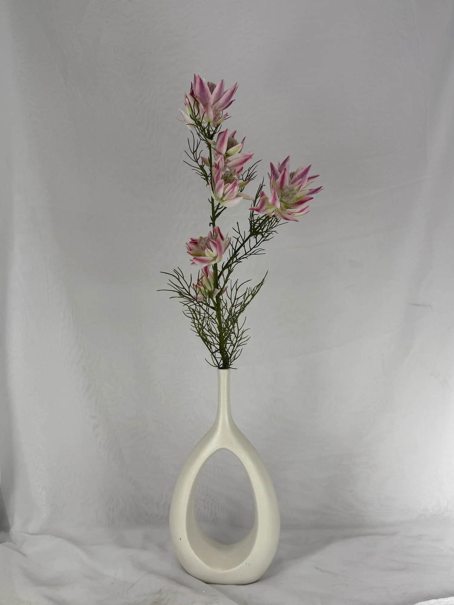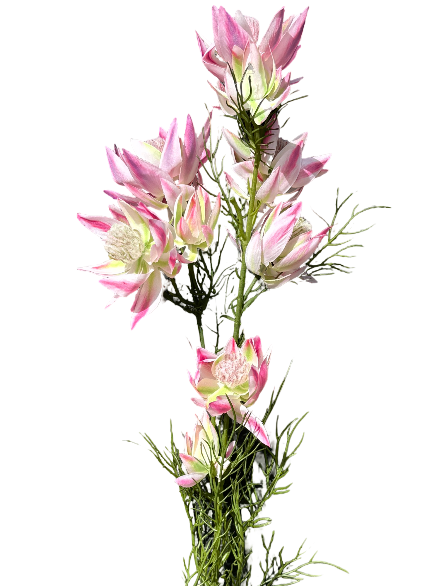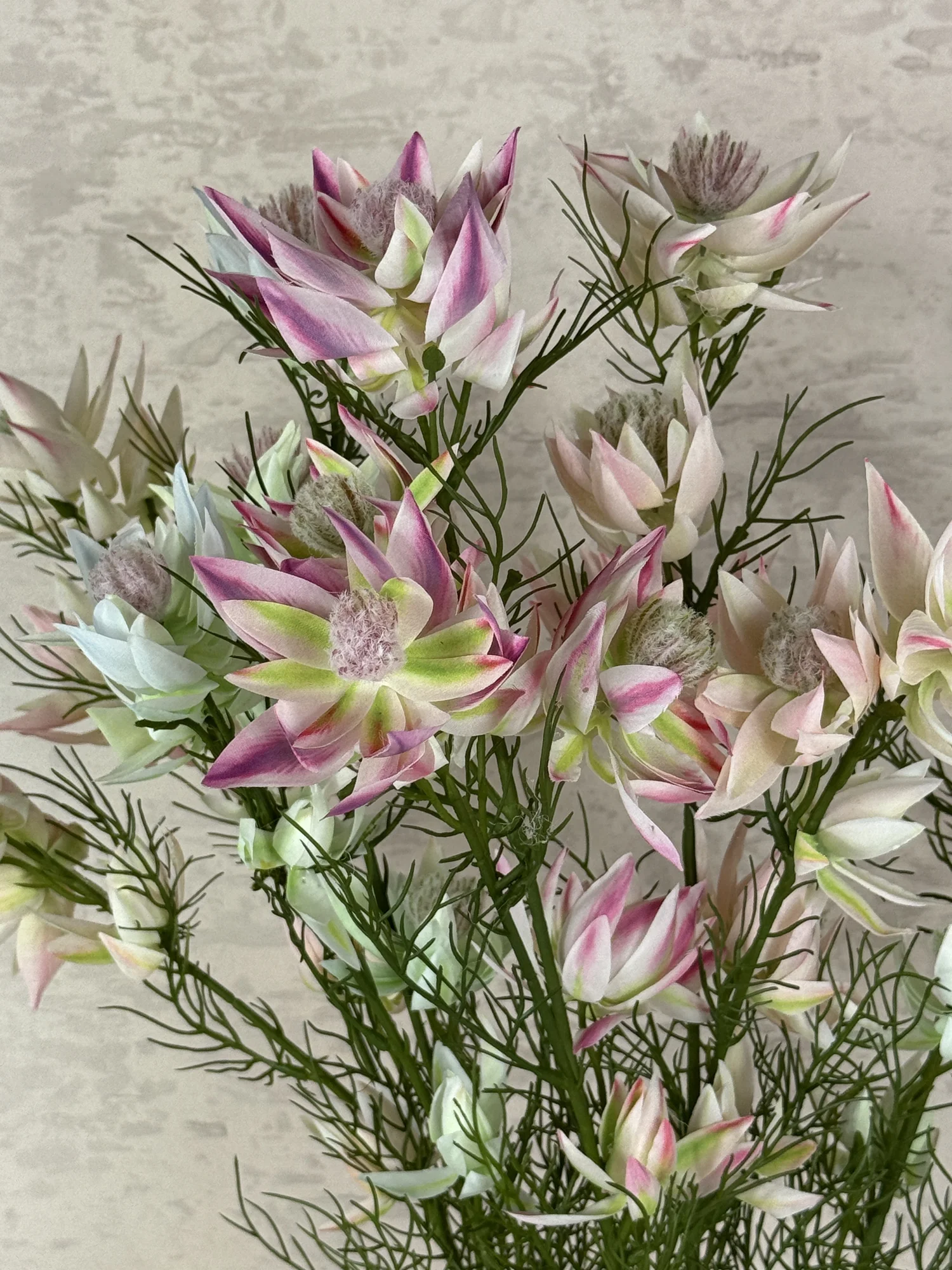 Inspired by Serruria florida, a South African species commonly known as Blushing Bride, this bloom is popular in wedding flowers for its soft blush colour and delicate, romantic appearance. Often used as a filler or feature flower in modern bouquets, it pairs well with roses, natives, or soft greenery.