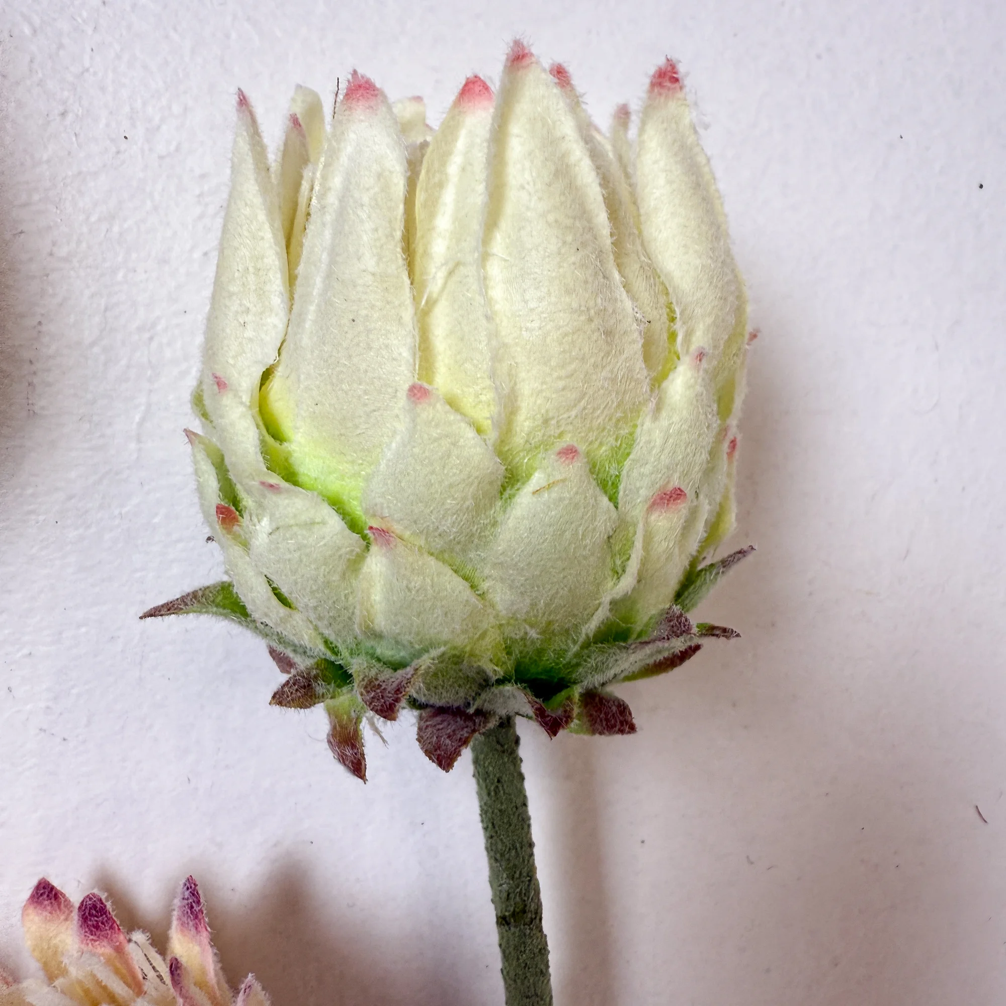 This green white small head protea artificial stem is designed to replicate the distinctive shape and texture of real protea flowers. The bloom features layered white petals with soft pink tips and green bases, creating natural colour variation that works well in both native and mixed floral arrangements.