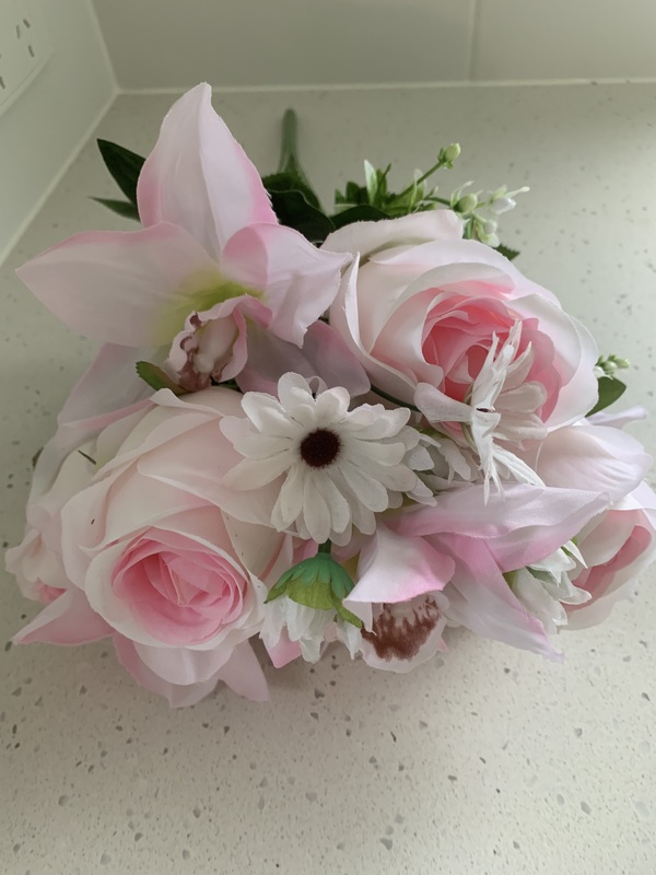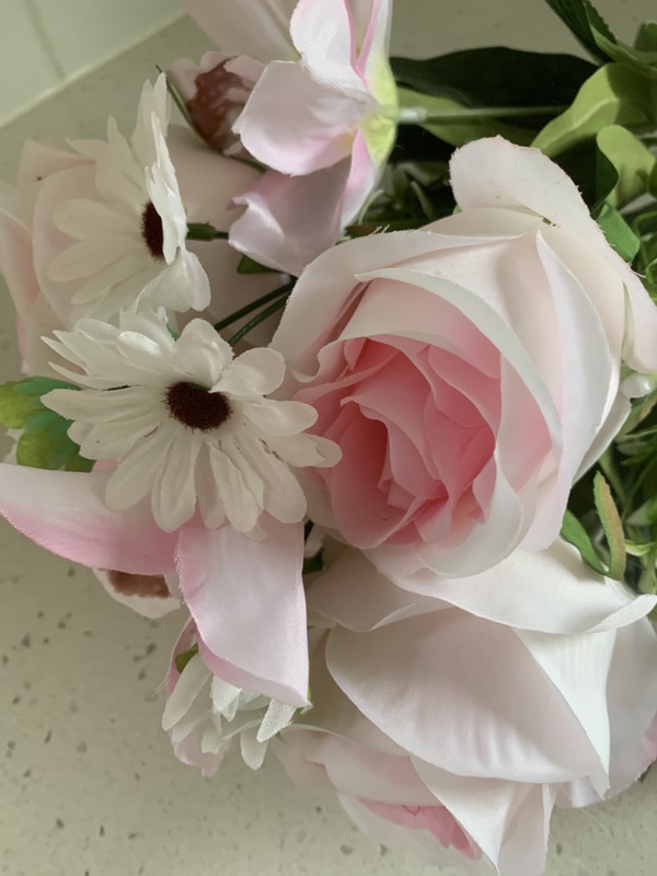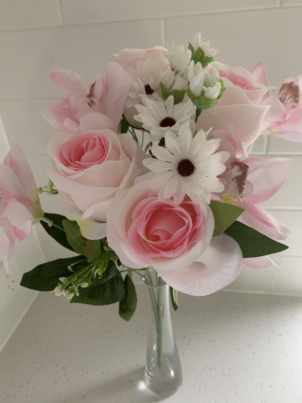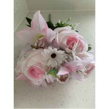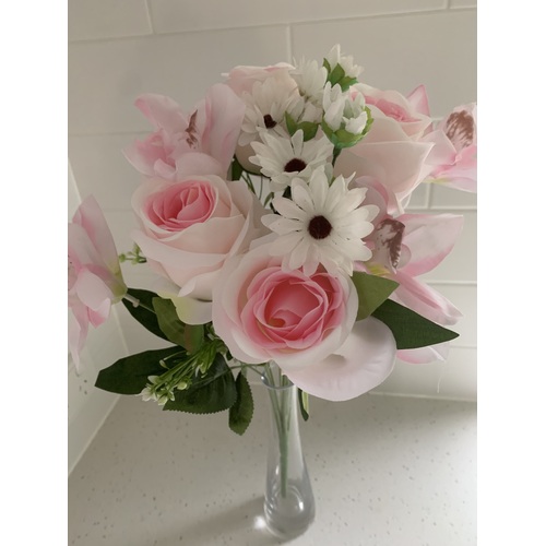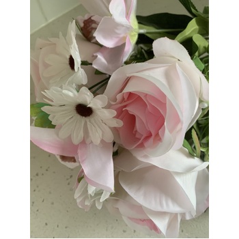 Qty: 12 stems 5 large Open Roses, 4 orchid stems and 2 small daisy stems.