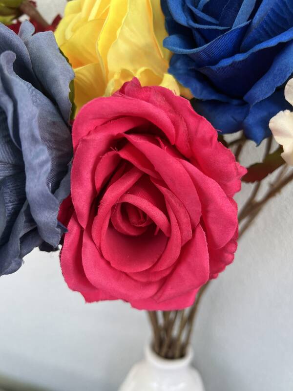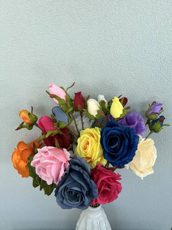 - Material: Fabric petals, plastic wired stem (flexible for styling)
