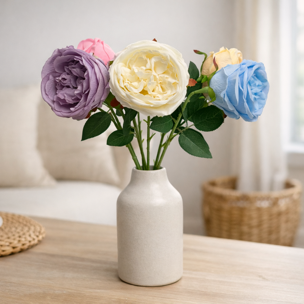 Our Artificial Blue David Austin Rose Stem features a full layered bloom designed to replicate the soft shape of a classic English garden rose. The realistic fabric petals and natural leaf detailing make this stem suitable for bouquets, centrepieces, ceremony styling and event décor.