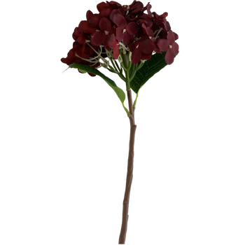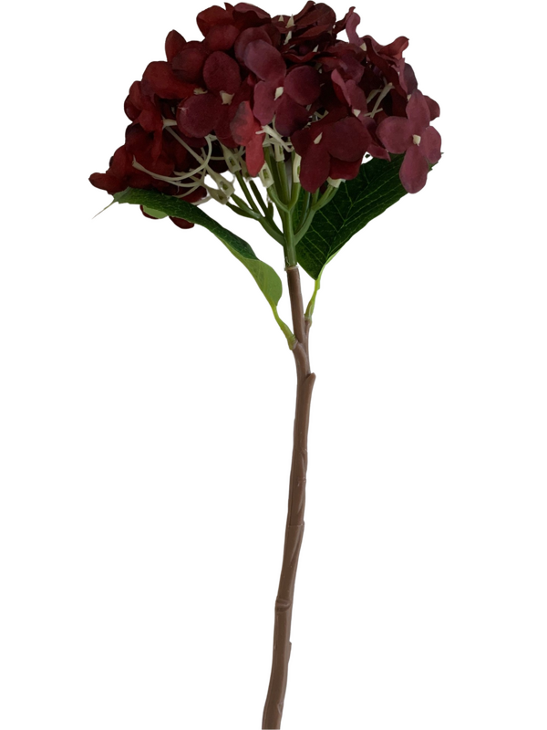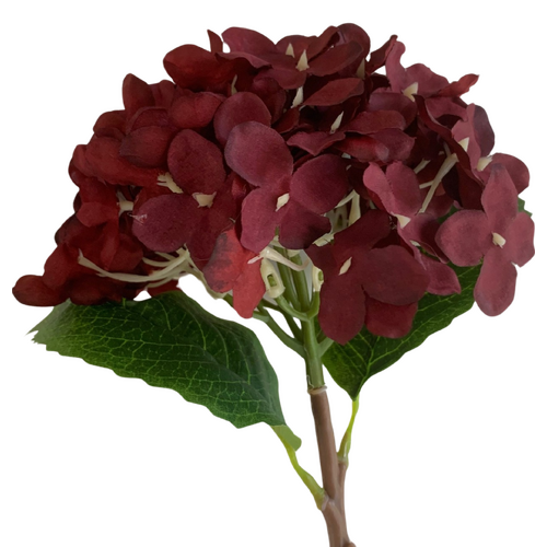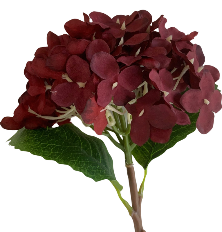 Foliage: Adorning the stem are two leaves, enhancing the overall natural look of the hydrangea. The leaves contribute to the fullness of the arrangement and provide a touch of greenery to complement the pristine Burgundy petals.