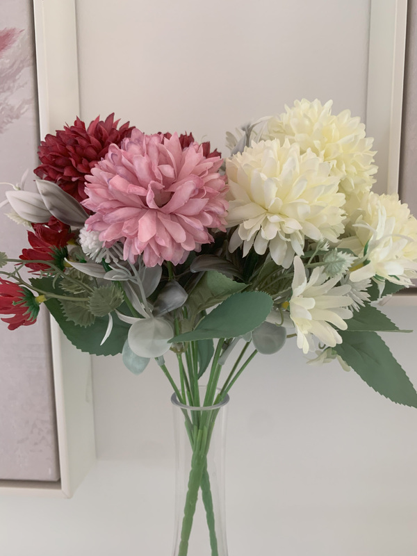 Qty: 7 stems on the bush, 4 with large flowers and 3 with greenery and daisies