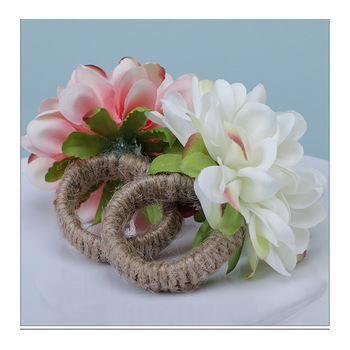 These beautiful napkin rings feature a stunning 6cm dahlia flower on a flexible ring wrapped in burlap. They are supplied as a pack of 4 and are perfect for wedding table decorations, dinner parties, and more.