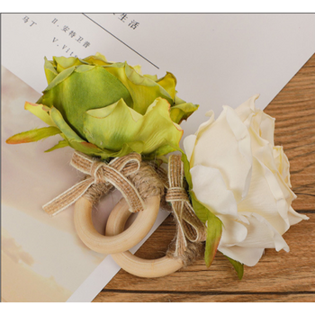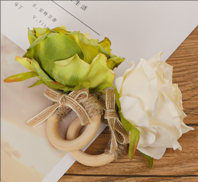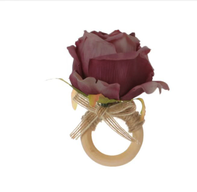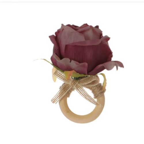 Capture the rustic charm and timeless beauty of roses with these exquisite napkin rings, handcrafted for your wedding celebration. Each set features four breathtaking 6cm faux roses, meticulously crafted in rich hues, adorning a natural wooden ring wrapped in burlap.