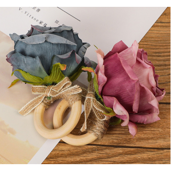 Capture the rustic charm and timeless beauty of roses with these exquisite napkin rings, handcrafted for your wedding celebration. Each set features four breathtaking 6cm faux roses, meticulously crafted in rich hues, adorning a natural wooden ring wrapped in burlap.