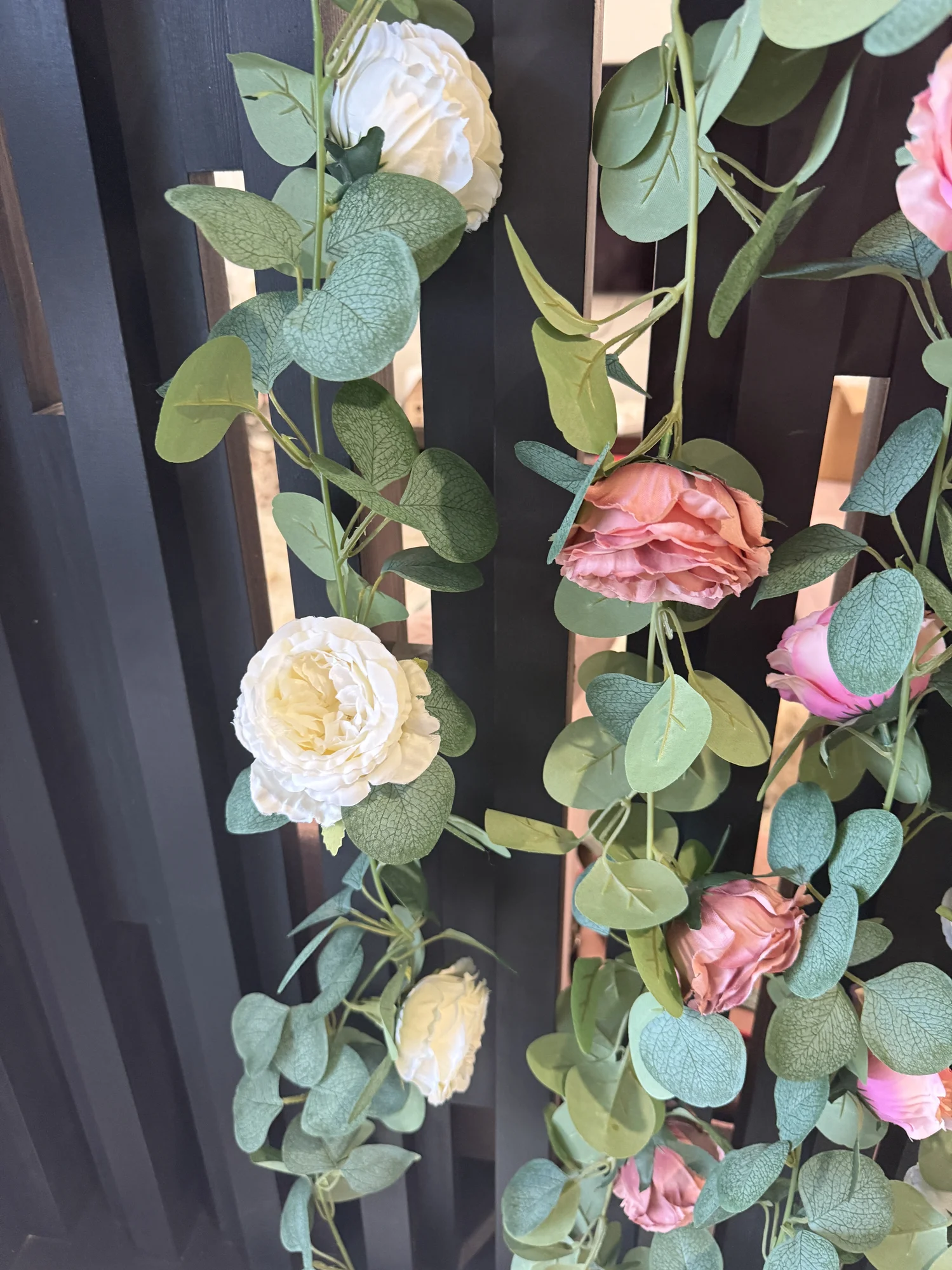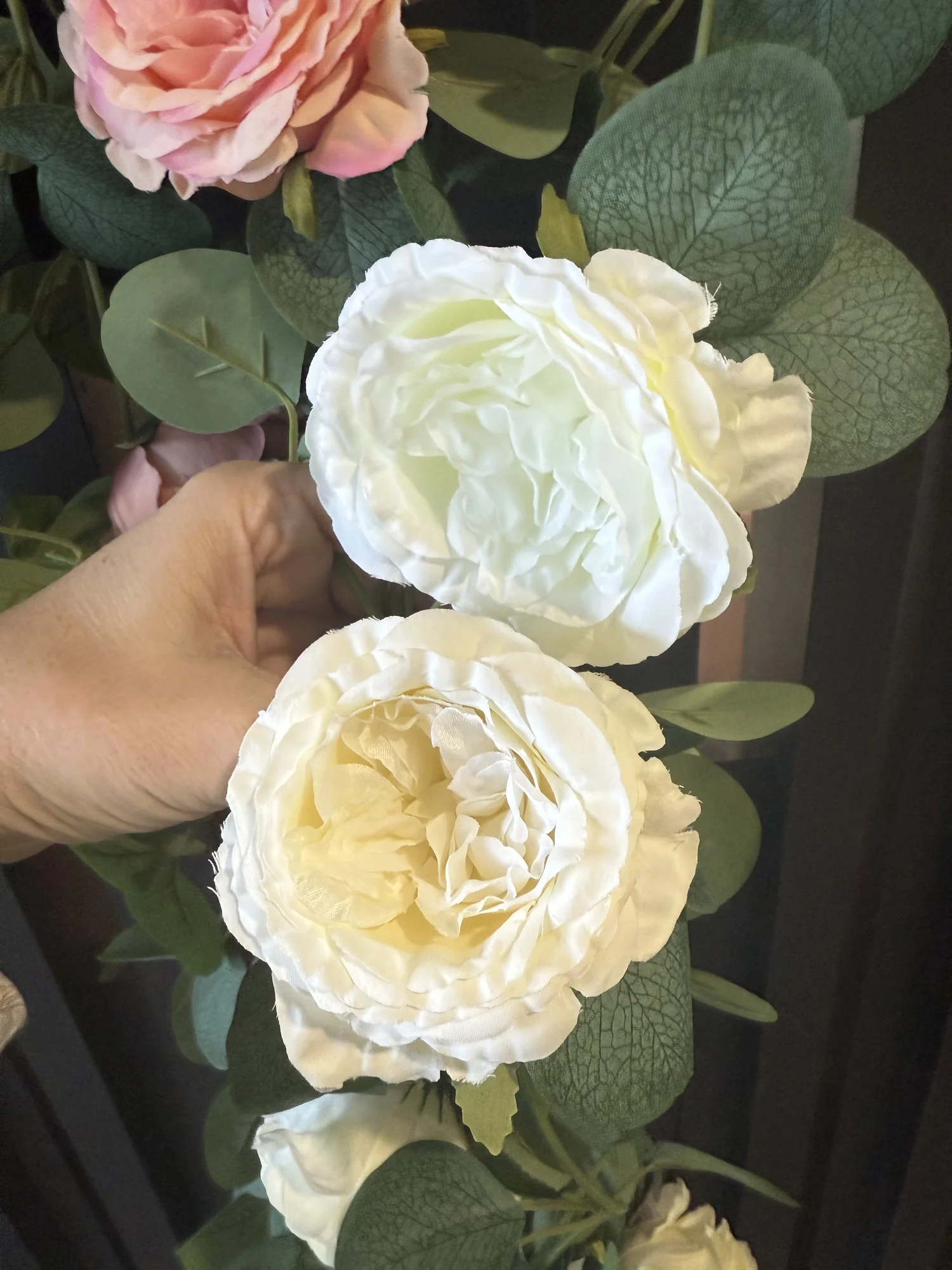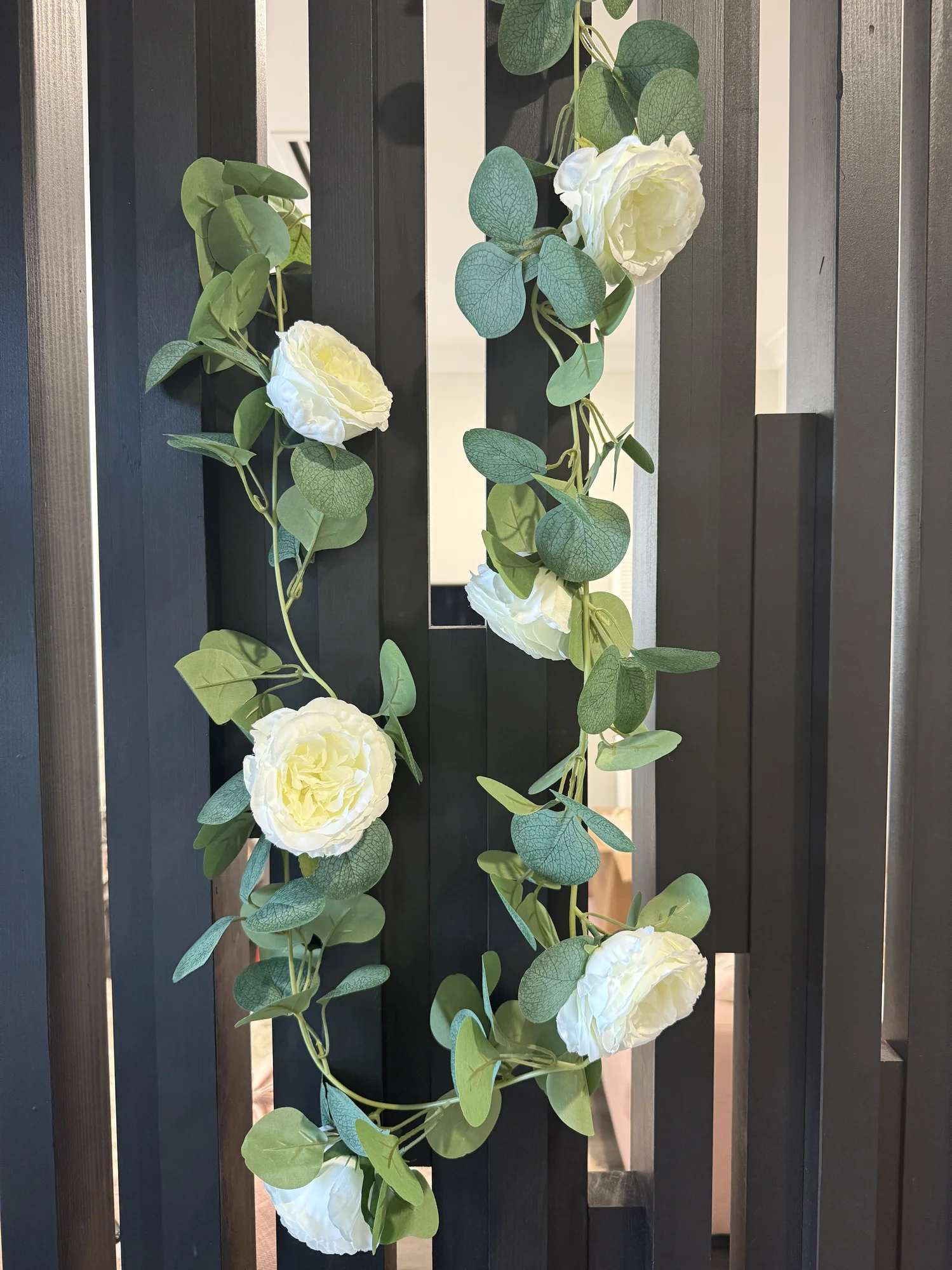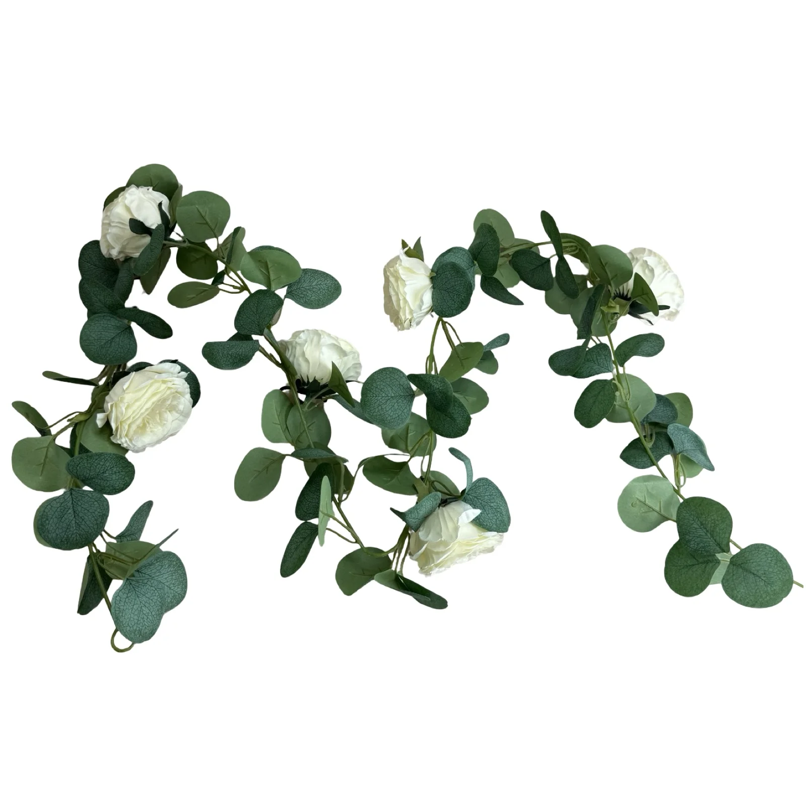 Our 1.6m Ivory Rose and Eucalyptus Garland is a versatile decoration for weddings, events, and home styling. Featuring lush silver dollar eucalyptus leaves and six full white roses with an 8cm diameter, this garland creates a natural look. A loop at one end makes it easy to hang or drape across arches, tables, and backdrops.