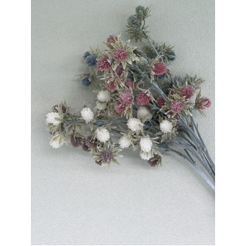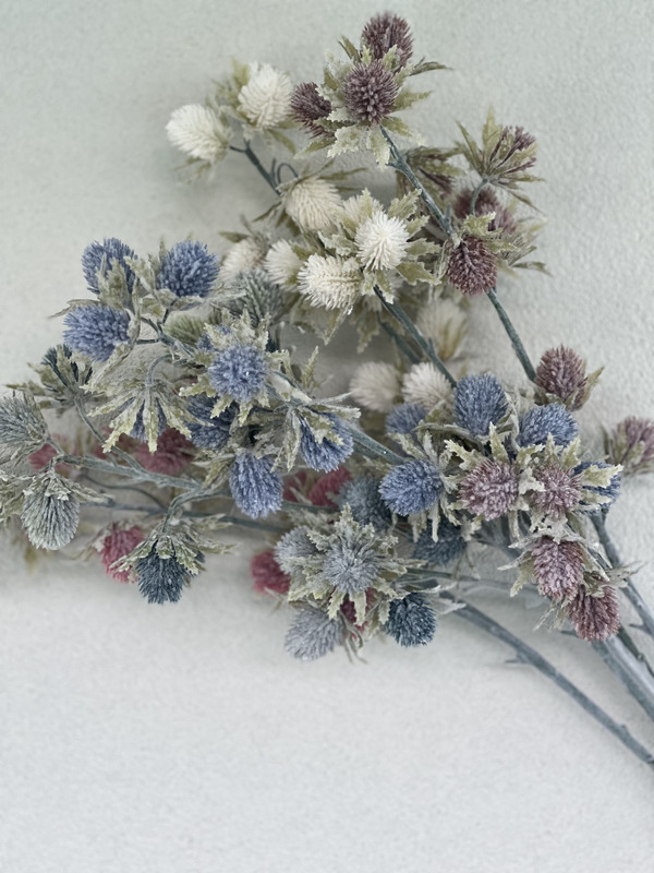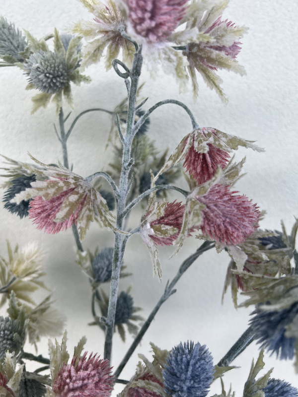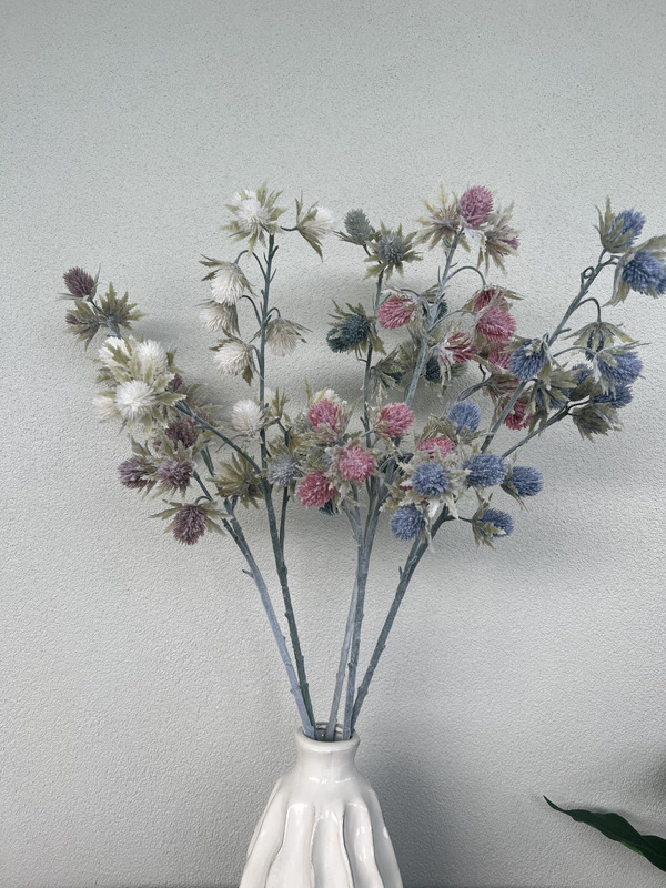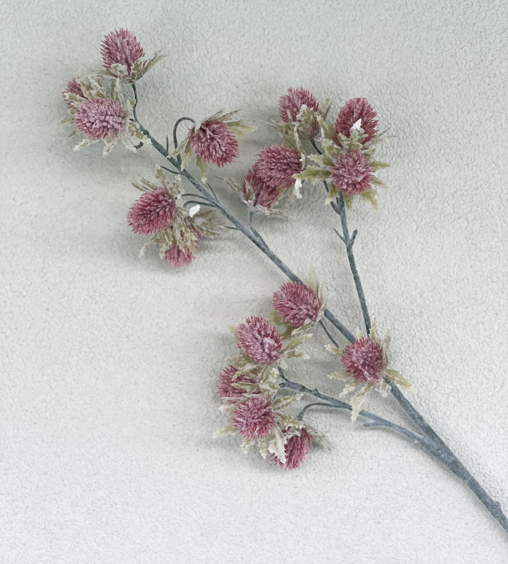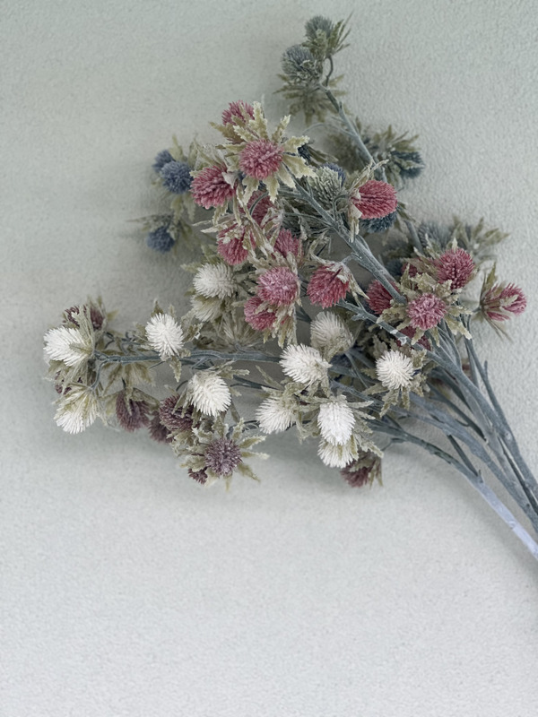 This artificial sea holly stem in dusty pink is perfect for creating romantic and sophisticated arrangements, offering all the beauty of fresh flowers with none of the upkeep.
