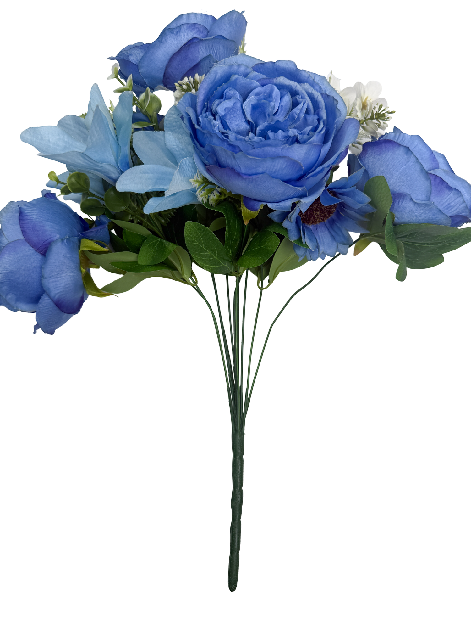 This large Bushy Blue Artificial Mixed Flower Bush is a practical option when larger quantities of flowers are needed for bouquets and arrangements. The bush includes peonies, lilies, daisies and greenery to create a full and natural looking floral mix.