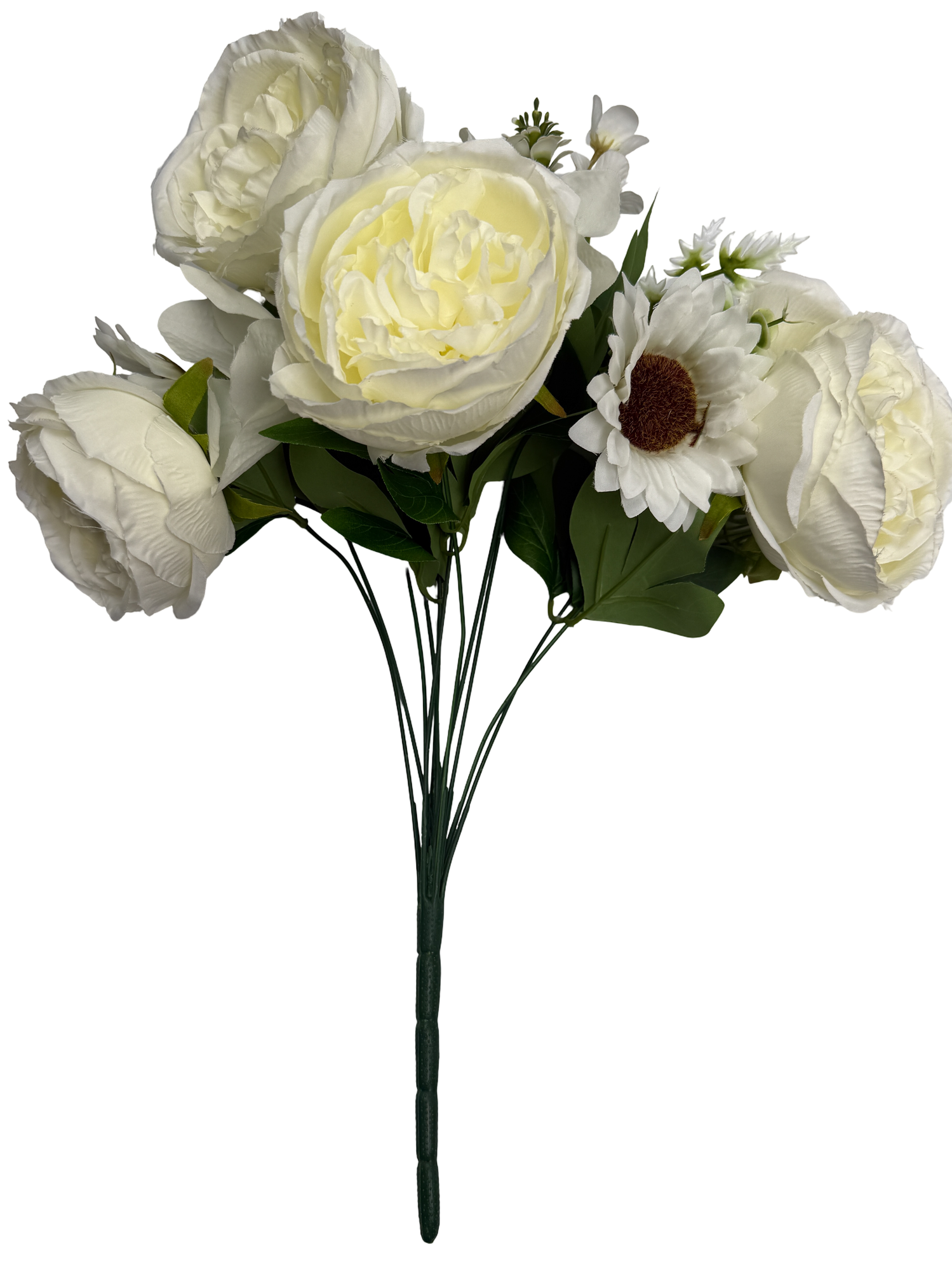 This large Bushy White/Cream Artificial Mixed Flower Bush is a practical option when larger quantities of flowers are needed for bouquets and arrangements. The bush includes peonies, lilies, daisies and greenery to create a full and natural looking floral mix.