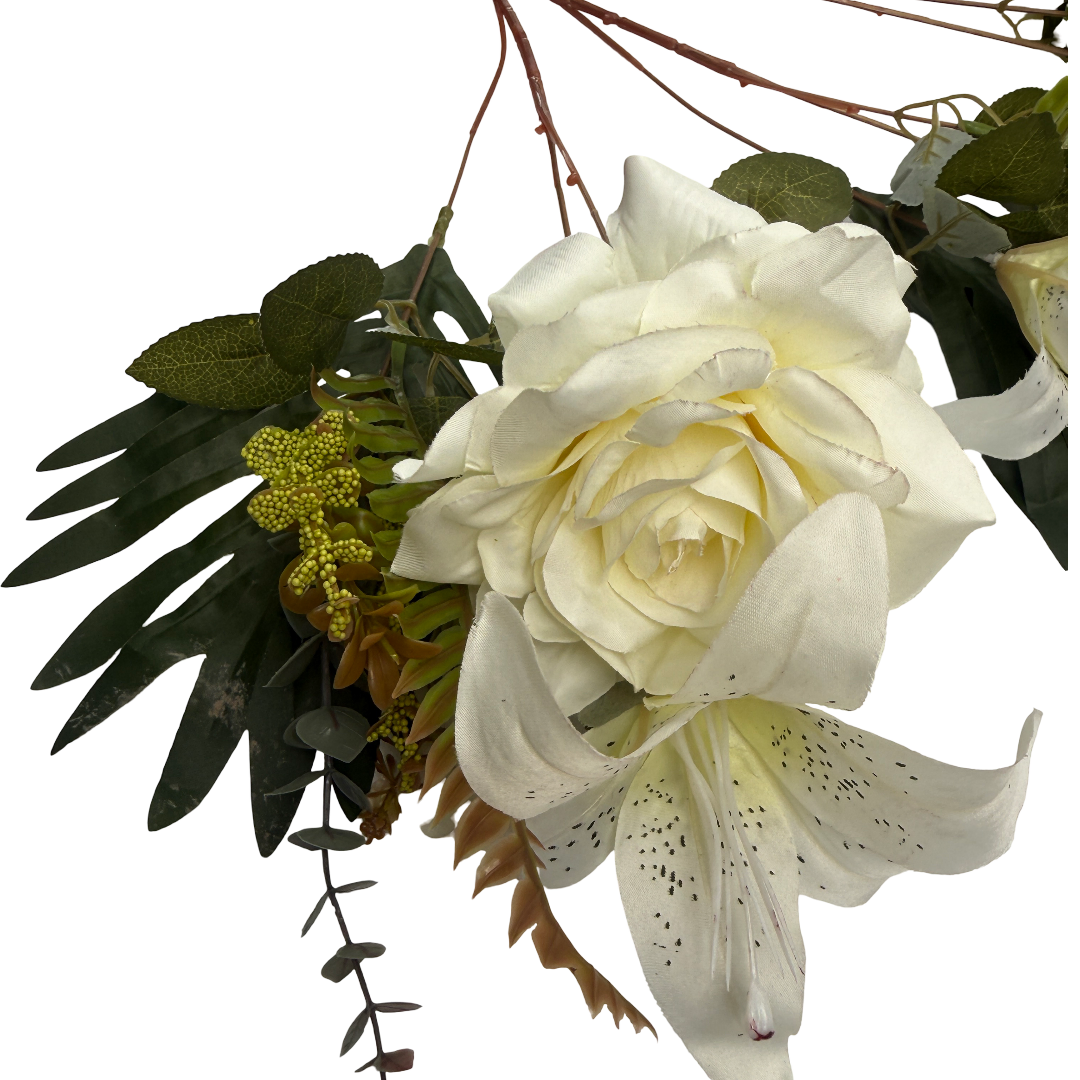 This artificial mixed rose and lily bush is suitable for bridal bouquets, bridesmaid bouquets, wedding centrepieces, ceremony flowers and venue styling. When separated into individual stems or branches, the flowers can also be used in floral foam, vases, arches and decorative installations.