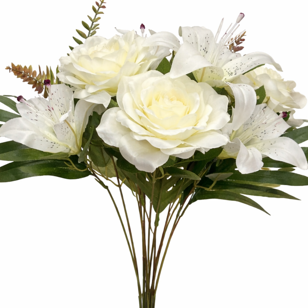 60cm - White Large 12 Stem Mixed Rose and Lily Flower Bush Artificial