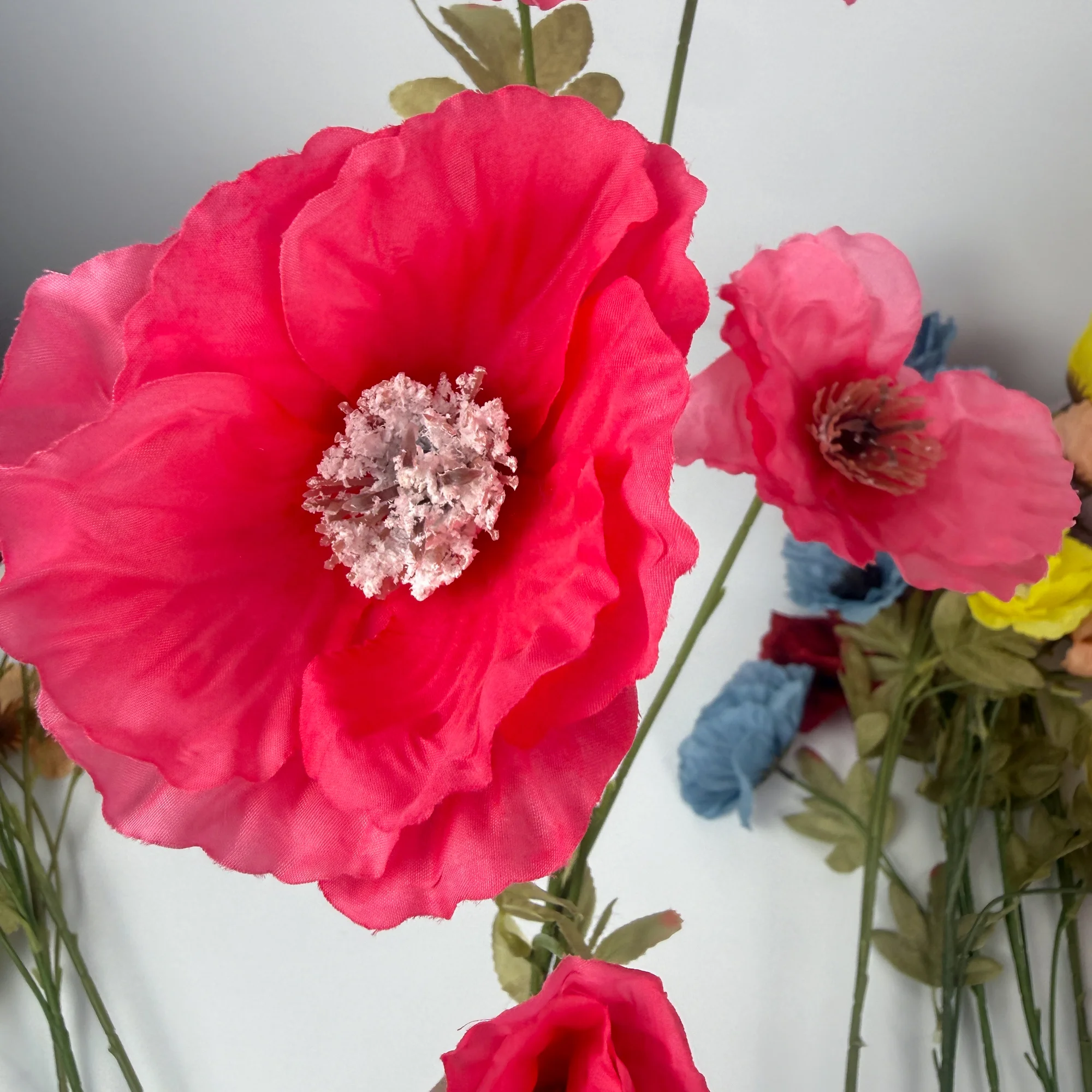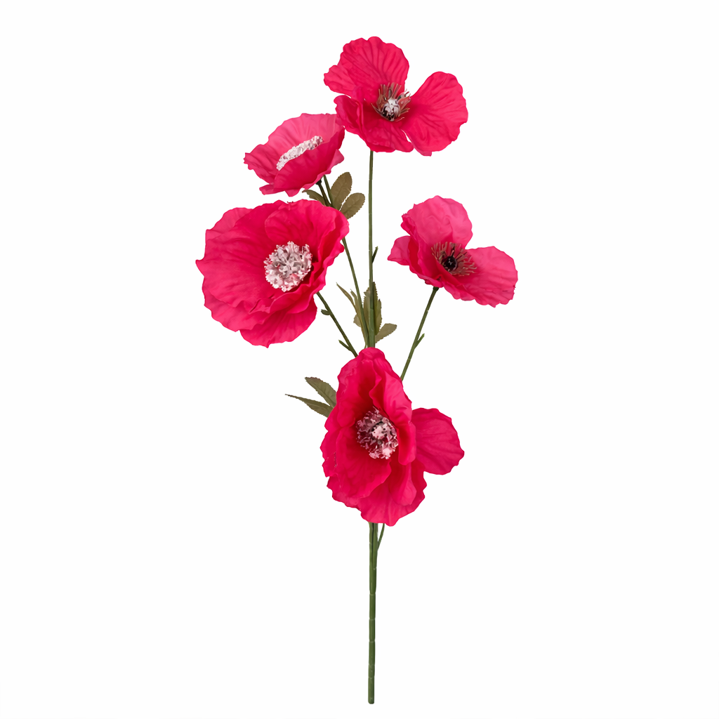 This Hot Pink Poppy Spray Stem is a 76cm silk fabric stem featuring five open poppy flower heads. It is a practical, budget-friendly option for adding height and bold colour to floral arrangements.