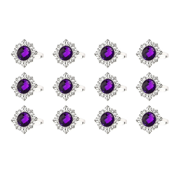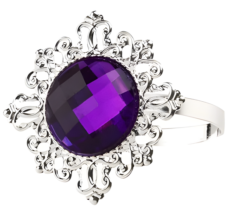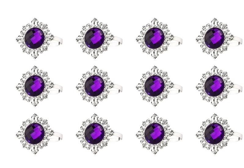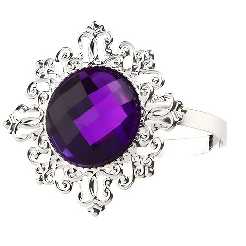 These stunning pack of 12 Purple diamond Ring-style napkin rings are crafted from metal. Each ring features a sparkling faux diamond and intricate filigree detailing, measuring 5cm in diameter (diamond and filigree) and the ring part fitting napkins up to 4cm wide.