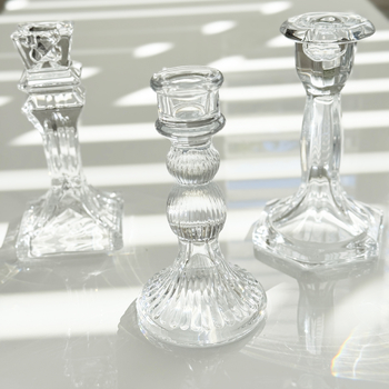This clear glass taper candle holder with a Round base is both decorative and functional, offering a sturdy base for standard dinner or taper candles. Its classic profile and Round base make it a standout piece in vintage, rustic, or traditional styling themes.