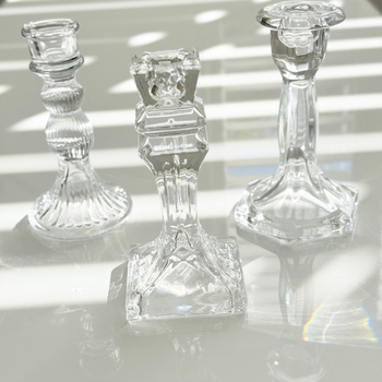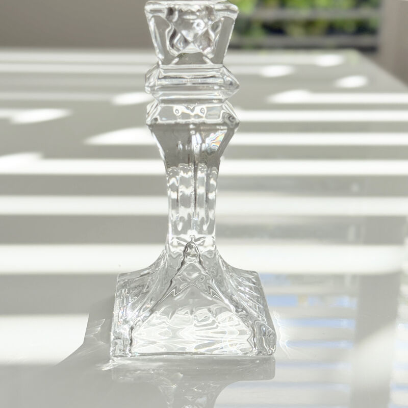 This clear glass taper candle holder with a square base is both decorative and functional, offering a sturdy base for standard dinner or taper candles. Its classic profile and Square design make it a standout piece in vintage, rustic, or traditional styling themes.