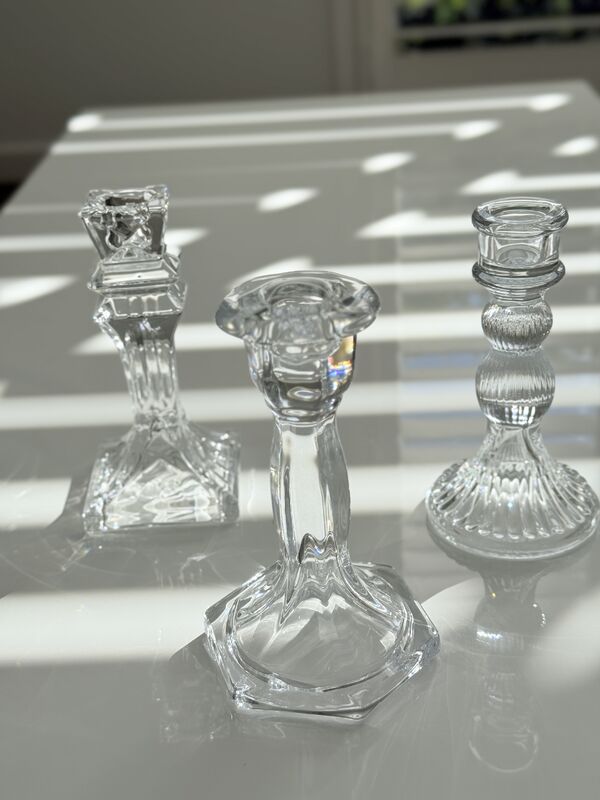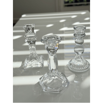 This clear glass taper candle holder with a hexagonal base is both decorative and functional, offering a sturdy base for standard dinner or taper candles. Its classic profile and hexagonal base make it a standout piece in vintage, rustic, or traditional styling themes.