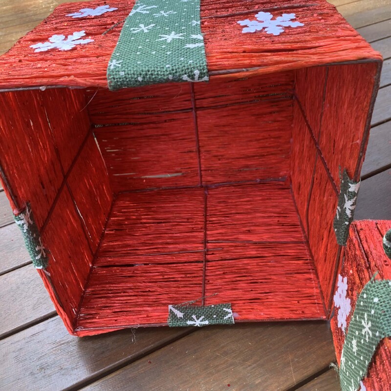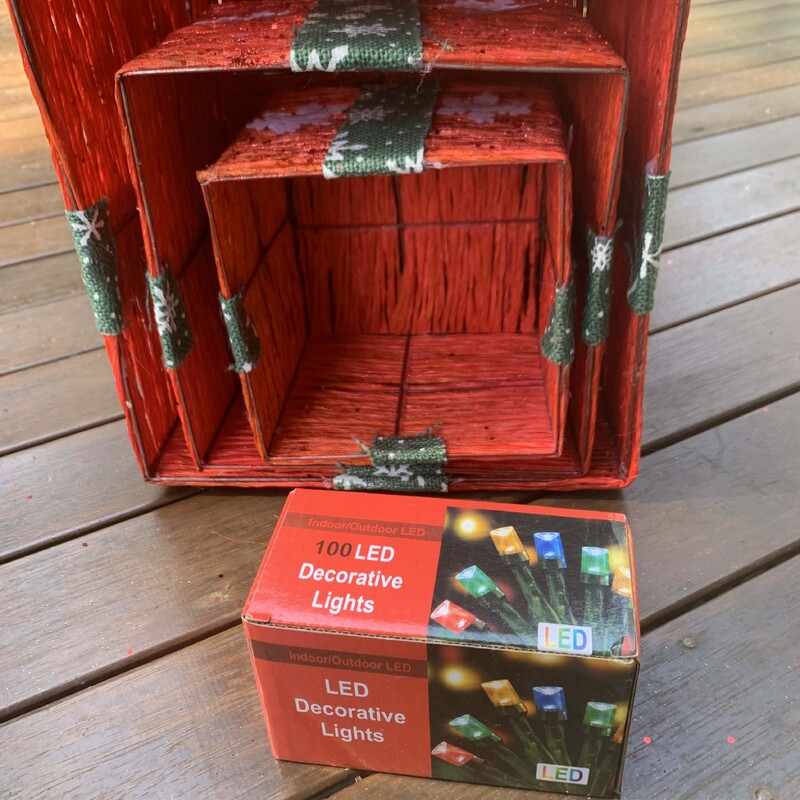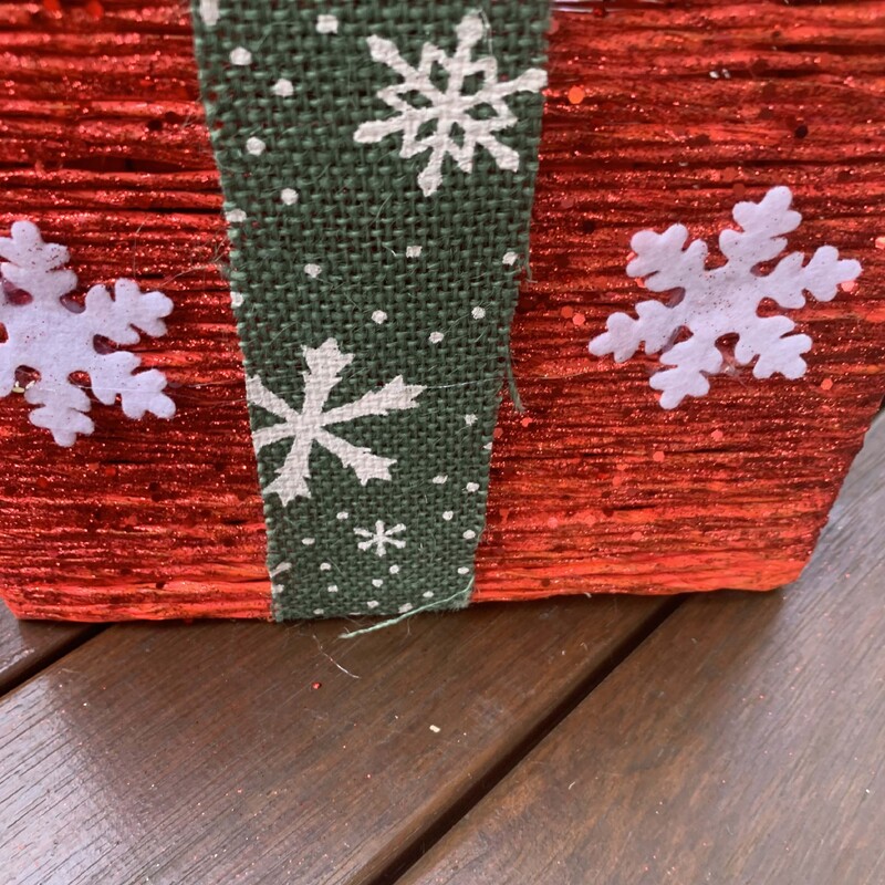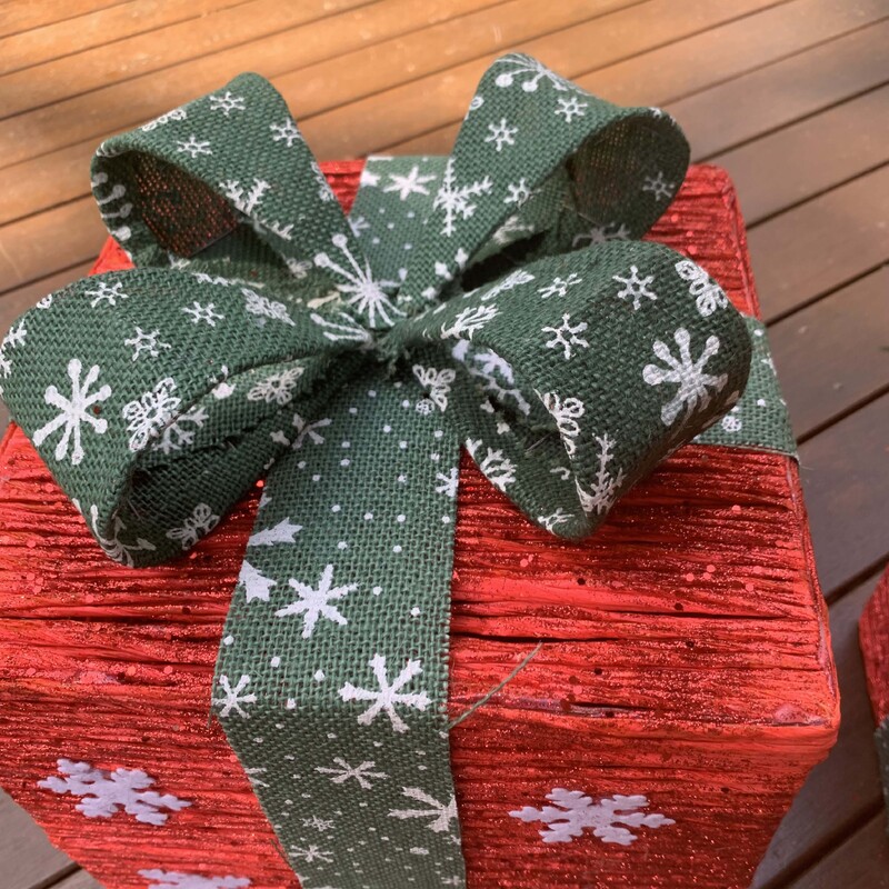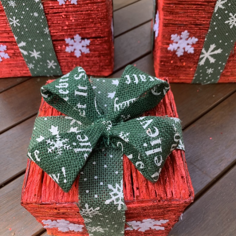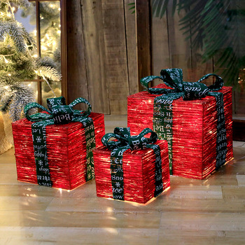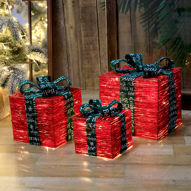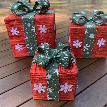 3pc set of Christmas gift boxes with LED lights, red covered boxes with green ribbon & snowflakes