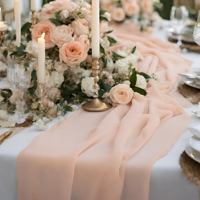 1. Delicate Beauty: Chiffon is known for its fine, delicate texture that instantly elevates your decor. Our table runners are crafted from high-quality chiffon, giving your tables a soft, romantic aura.