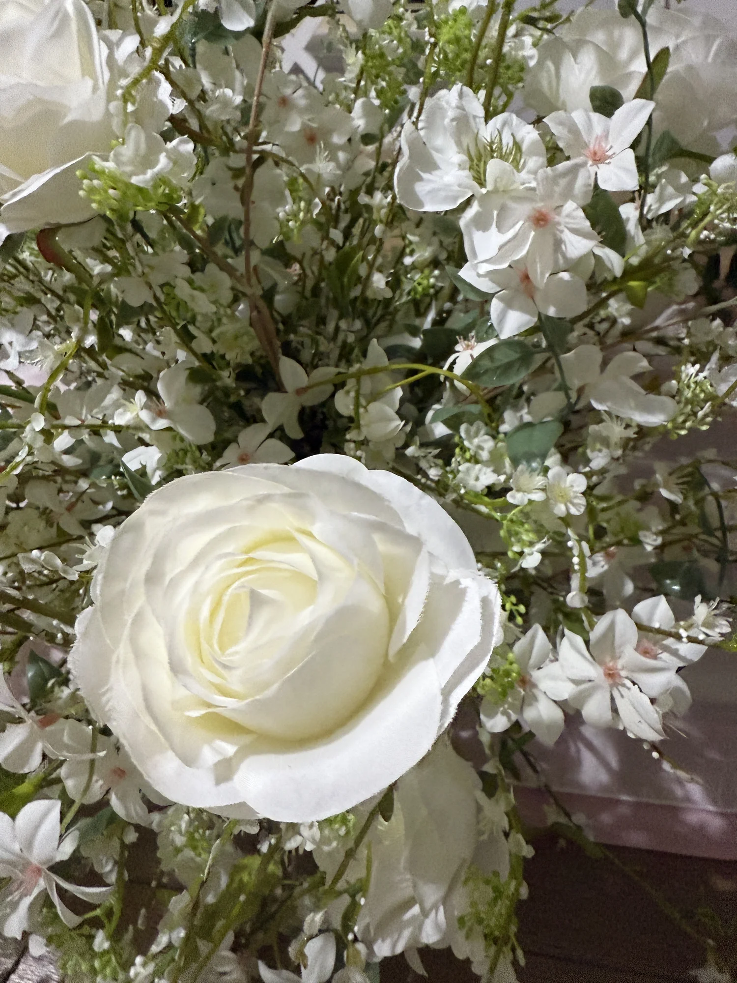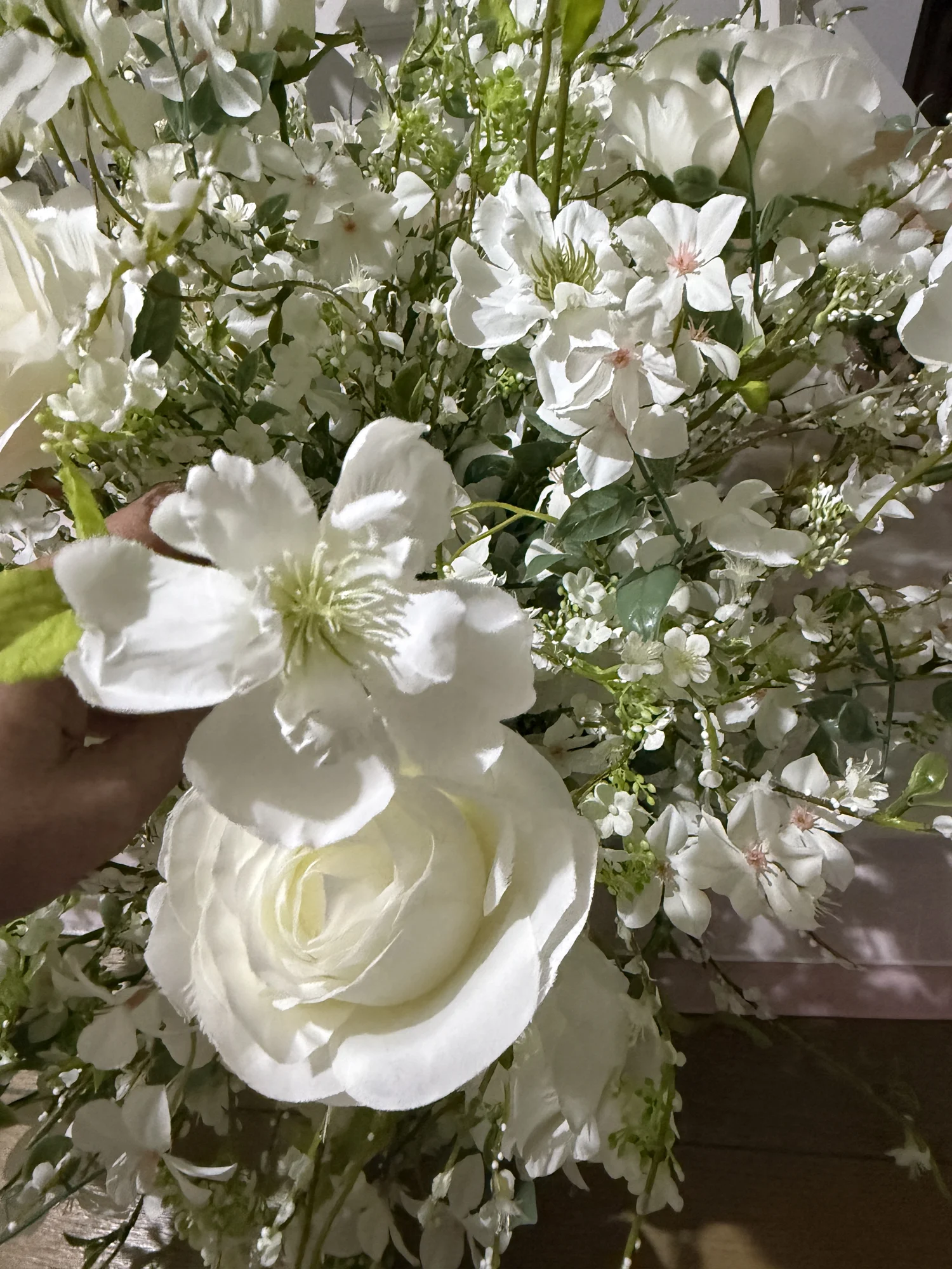 Flowers: White roses, cosmos-style flowers, soft filler blooms, mixed greenery