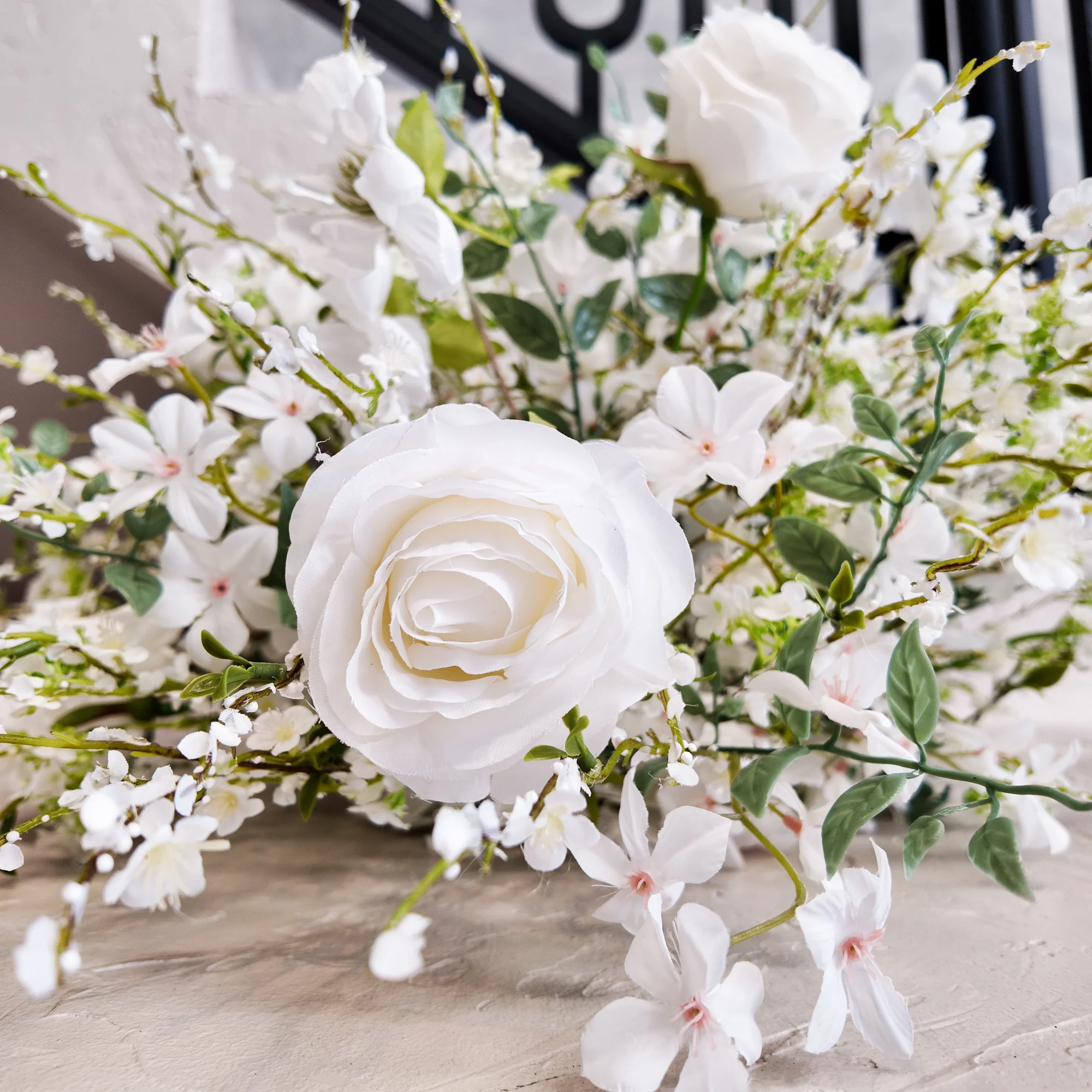 This 60cm artificial flower ball arrangement is designed for statement wedding and event styling. Made with white roses, cosmos-style blooms, soft filler flowers, and mixed greenery, it creates a light, meadow-inspired look that suits modern and romantic settings.